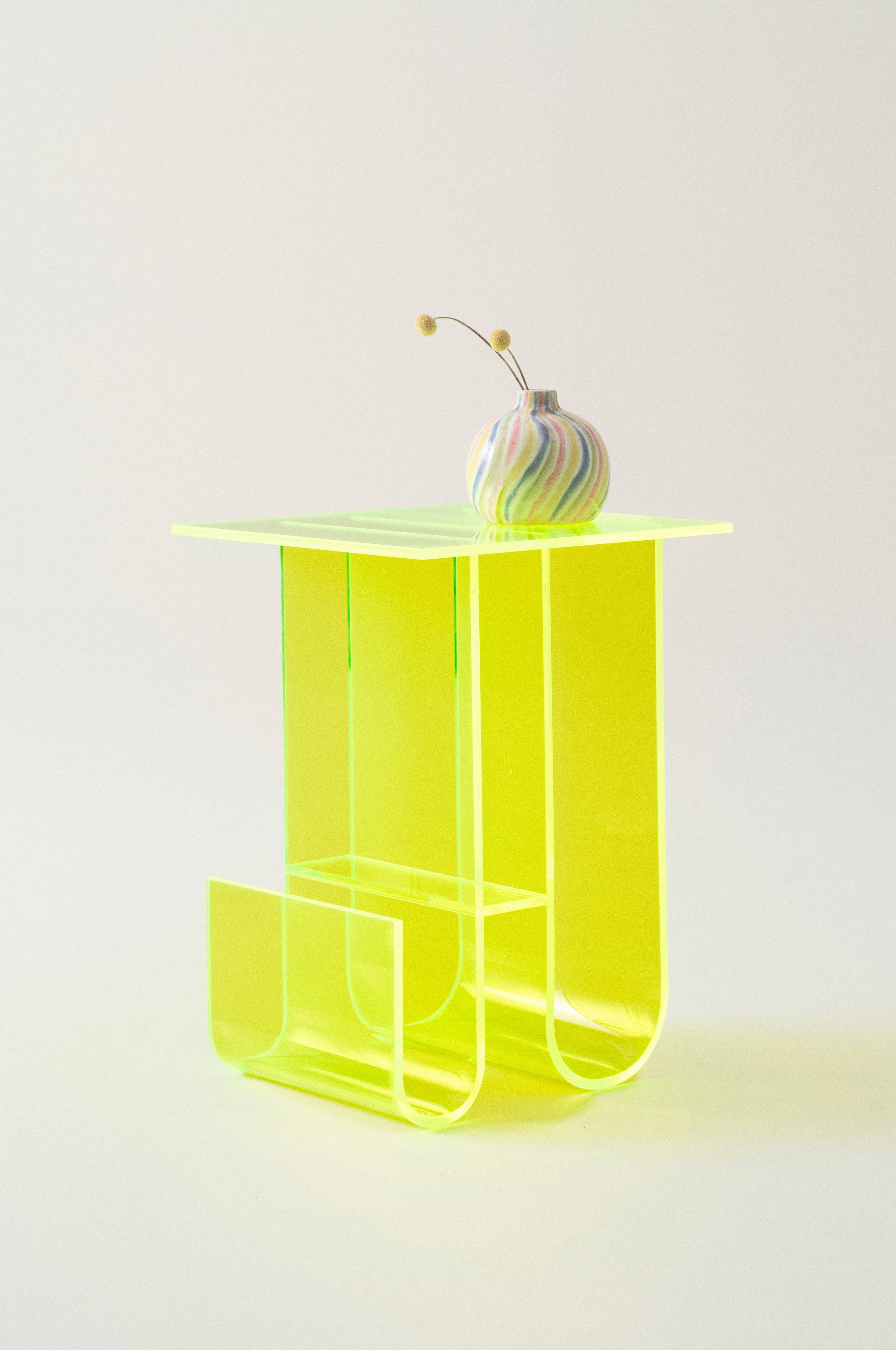 Sidobord av akrylglas. Det lilla bordet har läcker form med mjuka kurvor och futuristisk känsla. MORRISON har flexibel användning och passar som sidobord vid soffan, sängbord eller hallbord med lite plats för förvaring om så önskas. Färgvalen är härligt uppfriskande.