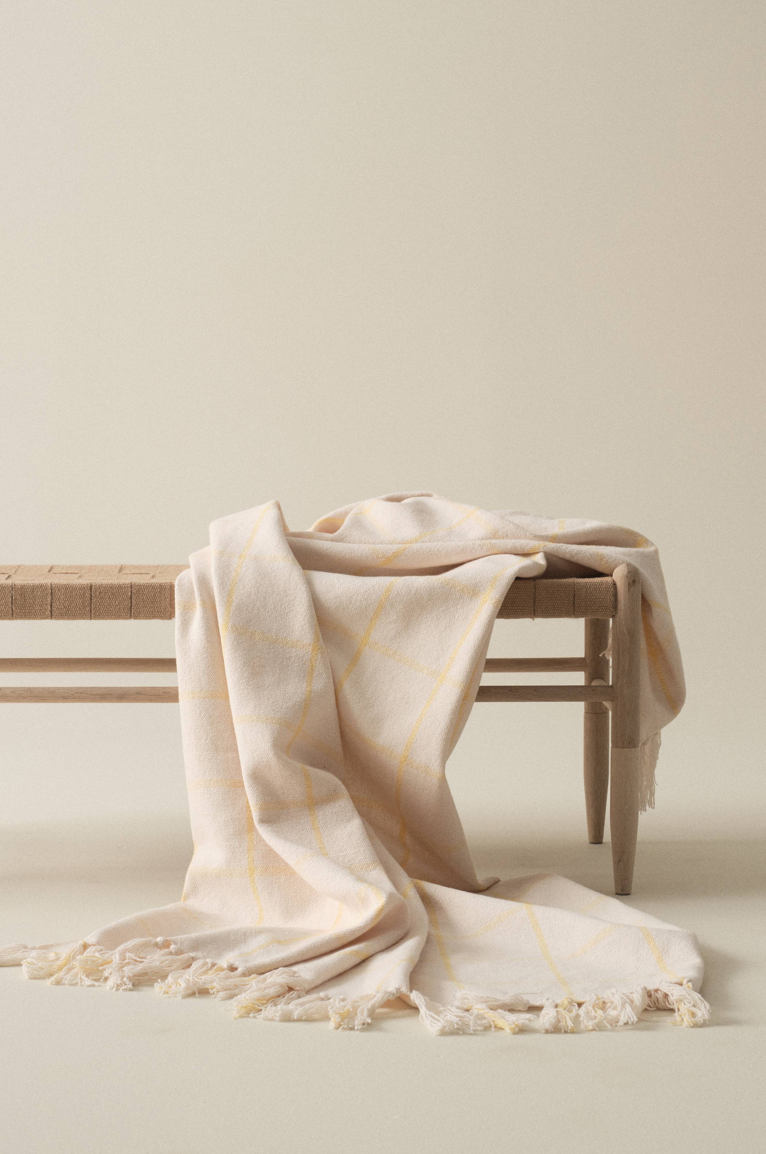 Handvävd pläd av bomull med garnfärgad ruta och knuten frans längs två sidor. Bomullskvalitén är mjuk och tät. MYRA är en luftig och behaglig sommarpläd, inte för varm utan alldeles lagom en ljummen sommarkväll. Den passar förstås utmärkt i soffan också och där fungerar den året runt.