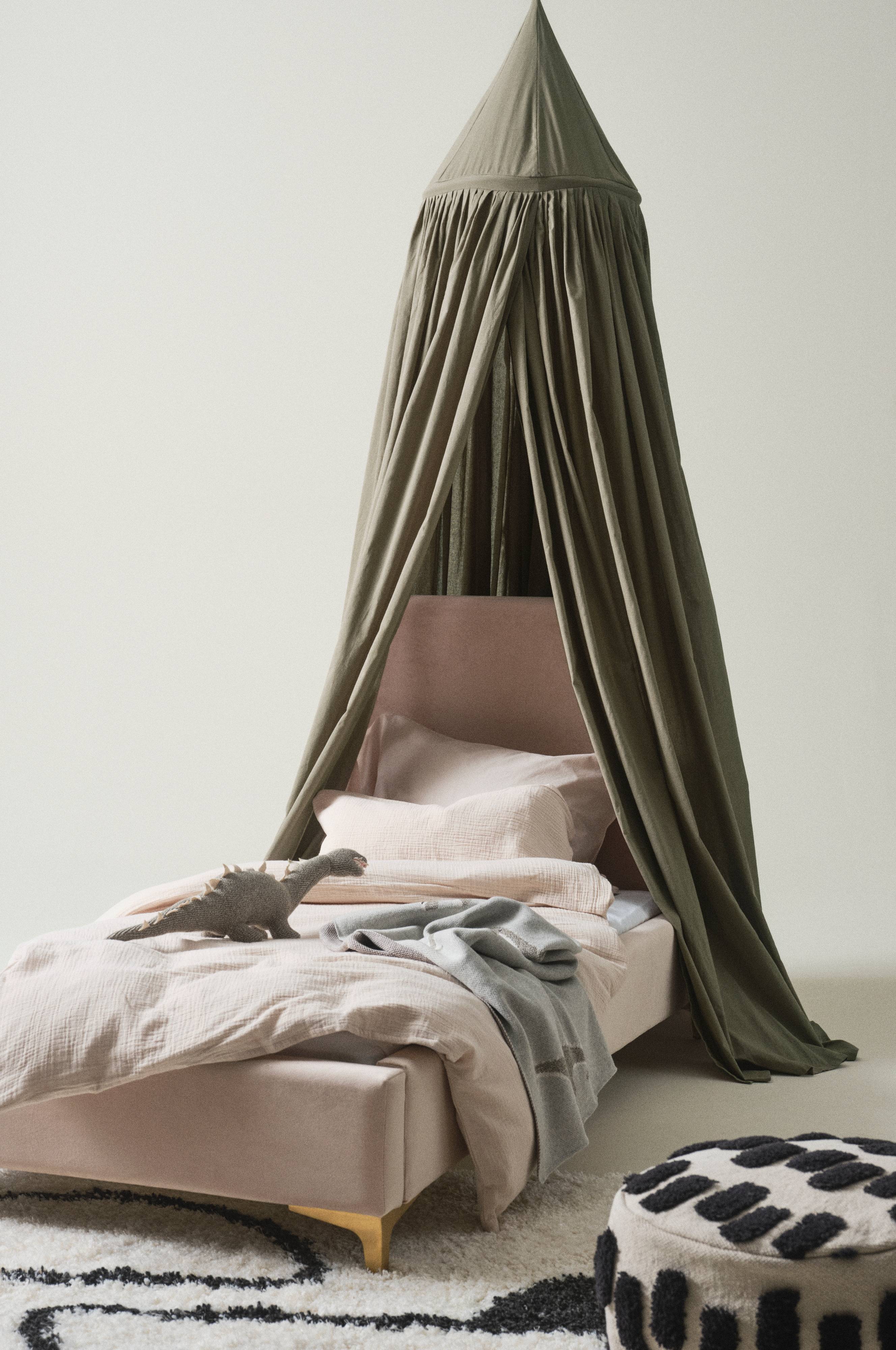 Sänghimmel tillverkad i tvättad ekologisk bomullskvalité. Bomullsgarnet är av en grövre typ och ger tyget en exklusiv look och linneliknande känsla. Denna sänghimmel är öppen både i framkant och bakkant, vilket är en fördel om du vill ha en sänglampa på väggen bakom sängen. Fäst sänghimlen i barnrummet för att skapa en mysig och ombonad atmosfär över barnsängen.