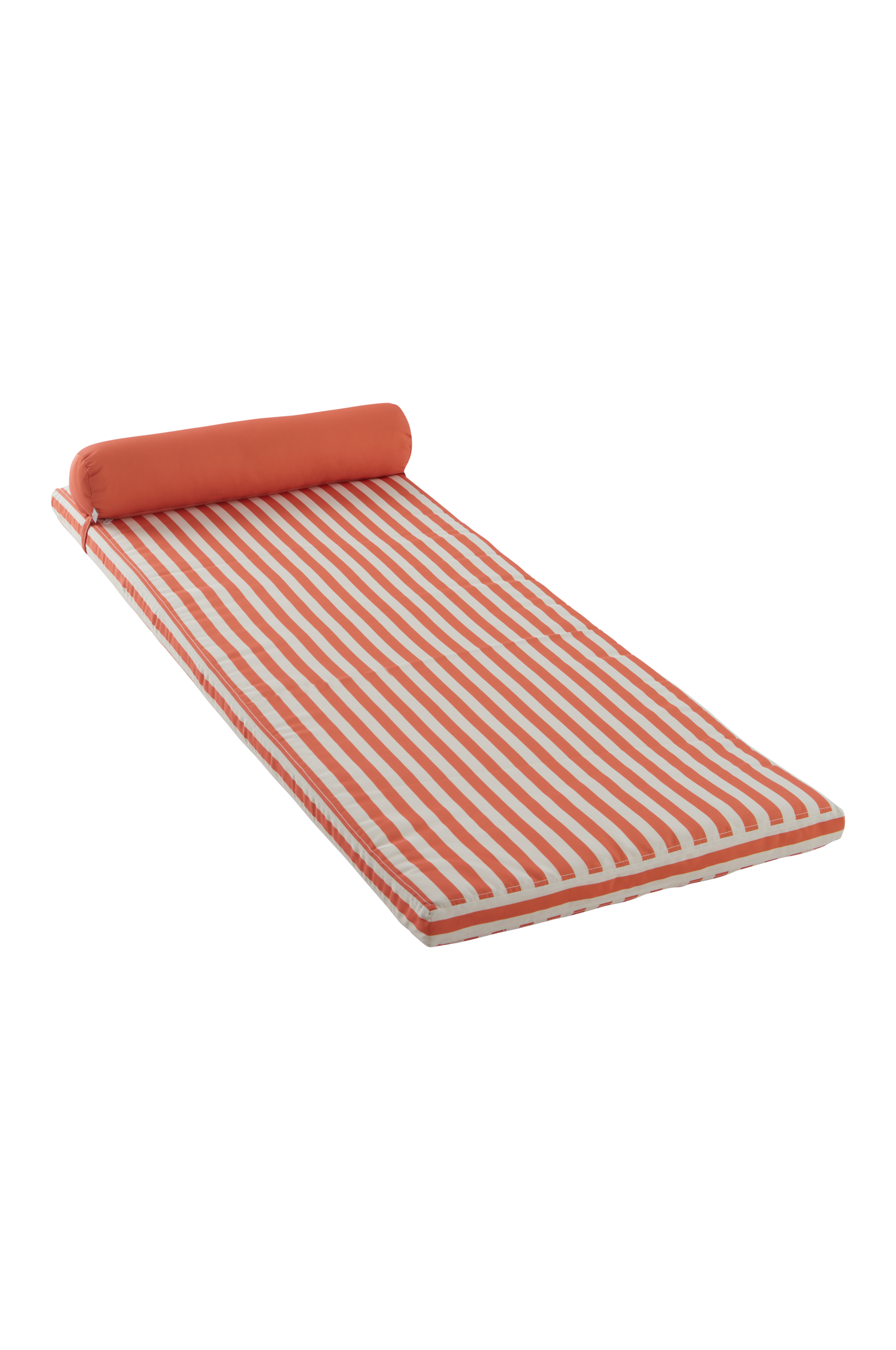 Randig madrass till solsängen. Till madrassen här en bekväm, enfärgad kudde. Tyget är av polyester med tryckt randmönster och vattenavvisande beläggning. Madrassen har skumfyllning. Klädseln har dragkedja och är avtagbar. Tygets slitstyrka 30000 Martindale.