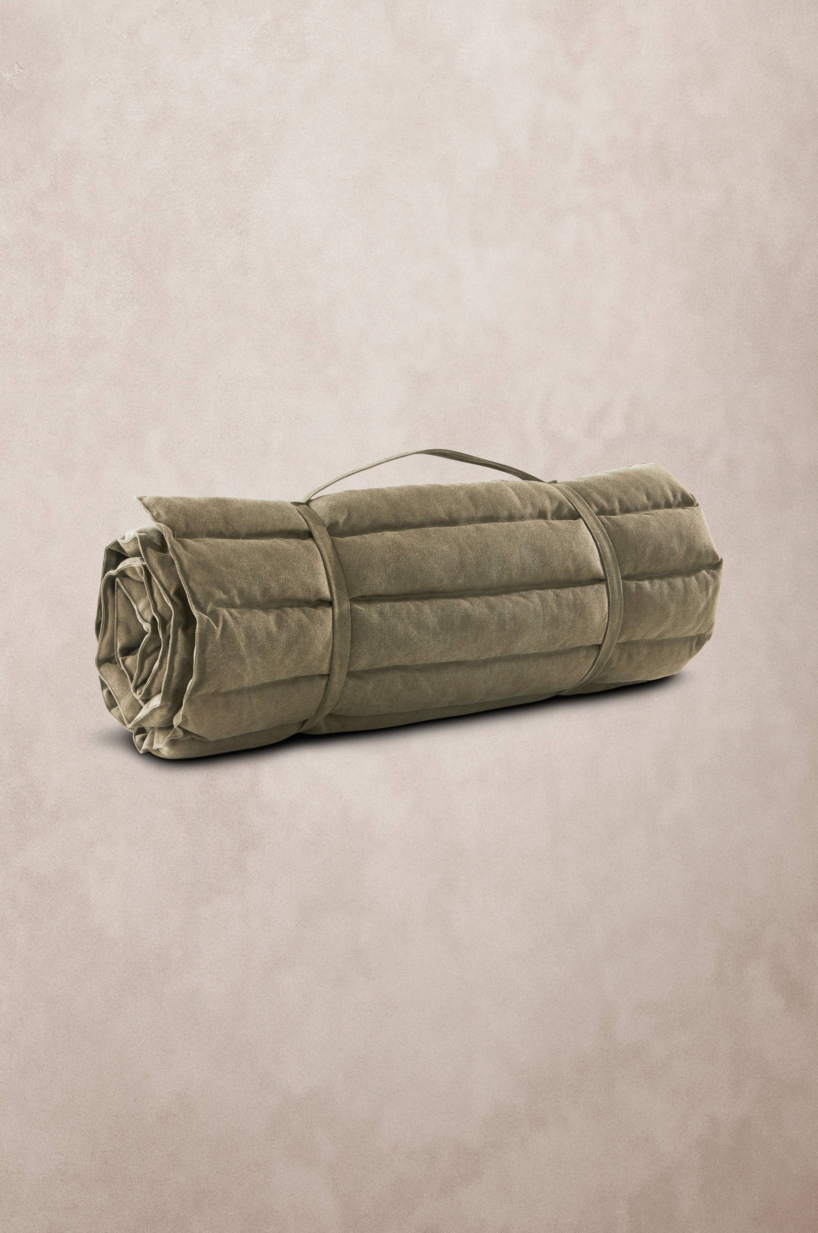 Strandmadrass med yttertyg i tvättad canvas av återvunnen bomull och polyester. Fyllningen är av polyester. Madrassen är kanalquiltad så att fyllningen hålls på plats och den blir också enklare att rulla ihop. Knytband runt om och bärhandtag gör den smidig att ta med.