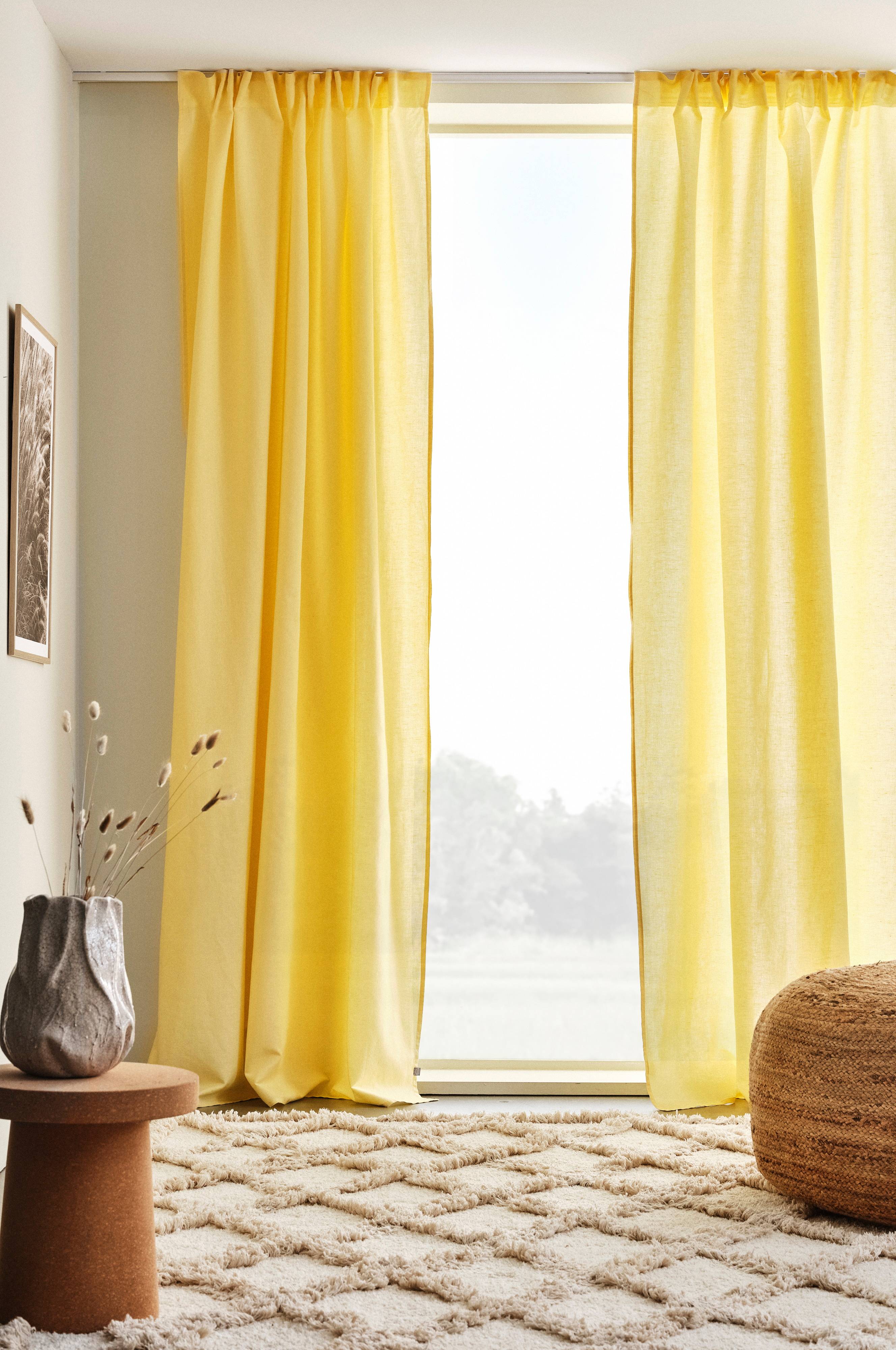 Två gardinlängder i linne- och bomullsmix, enfärgade i flera naturnära färger. I det enkla bor det vackra. Längderna har påsytt multifunktionsband och kan hängas upp med fingerkrokar, kanal samt dold hälla. Blandningen av bomull och lin ger en lättskött kvalité med fördelar från både bomull och lin. Linet för med sig den lite fastare strukturen och tillsammans med den mjuka bomullen blir tyget följsamt och faller fint.