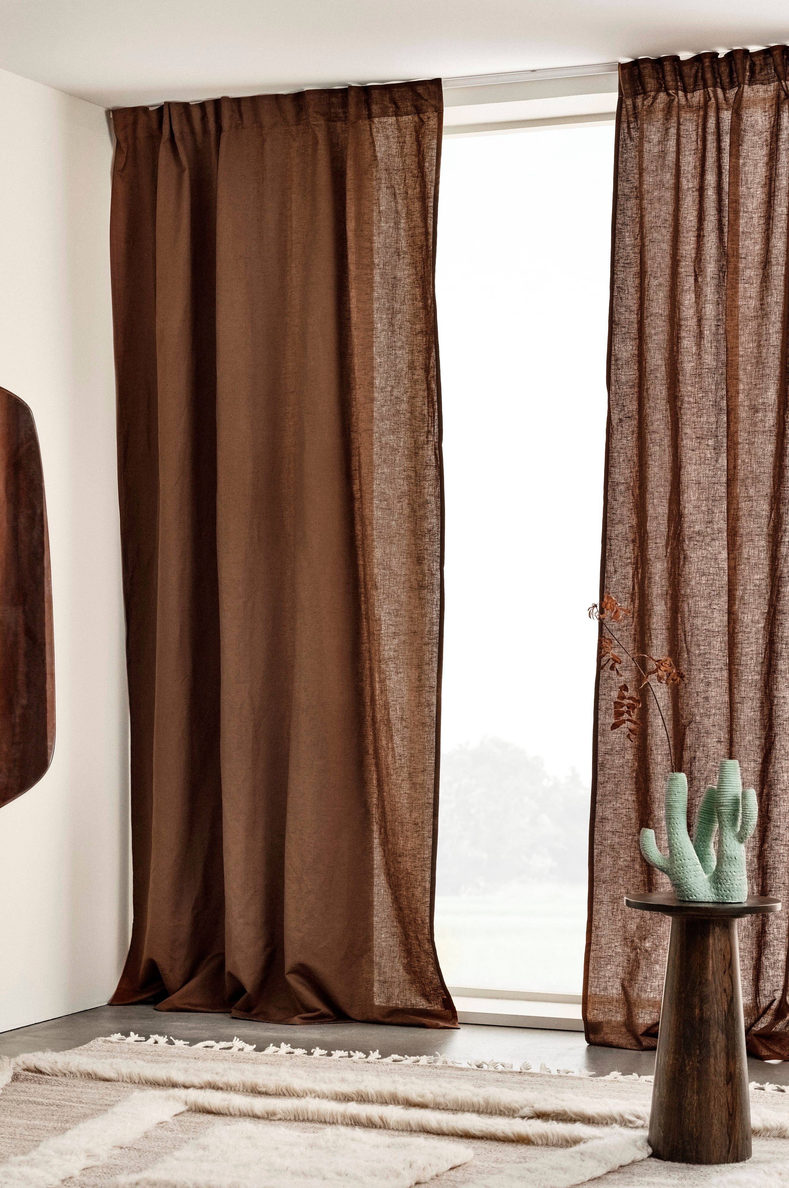 Två gardinlängder i linne- och bomullsmix, enfärgade i flera naturnära färger. I det enkla bor det vackra. Längderna har påsytt multifunktionsband och kan hängas upp med fingerkrokar, kanal samt dold hälla. Blandningen av bomull och lin ger en lättskött kvalité med fördelar från både bomull och lin. Linet för med sig den lite fastare strukturen och tillsammans med den mjuka bomullen blir tyget följsamt och faller fint.