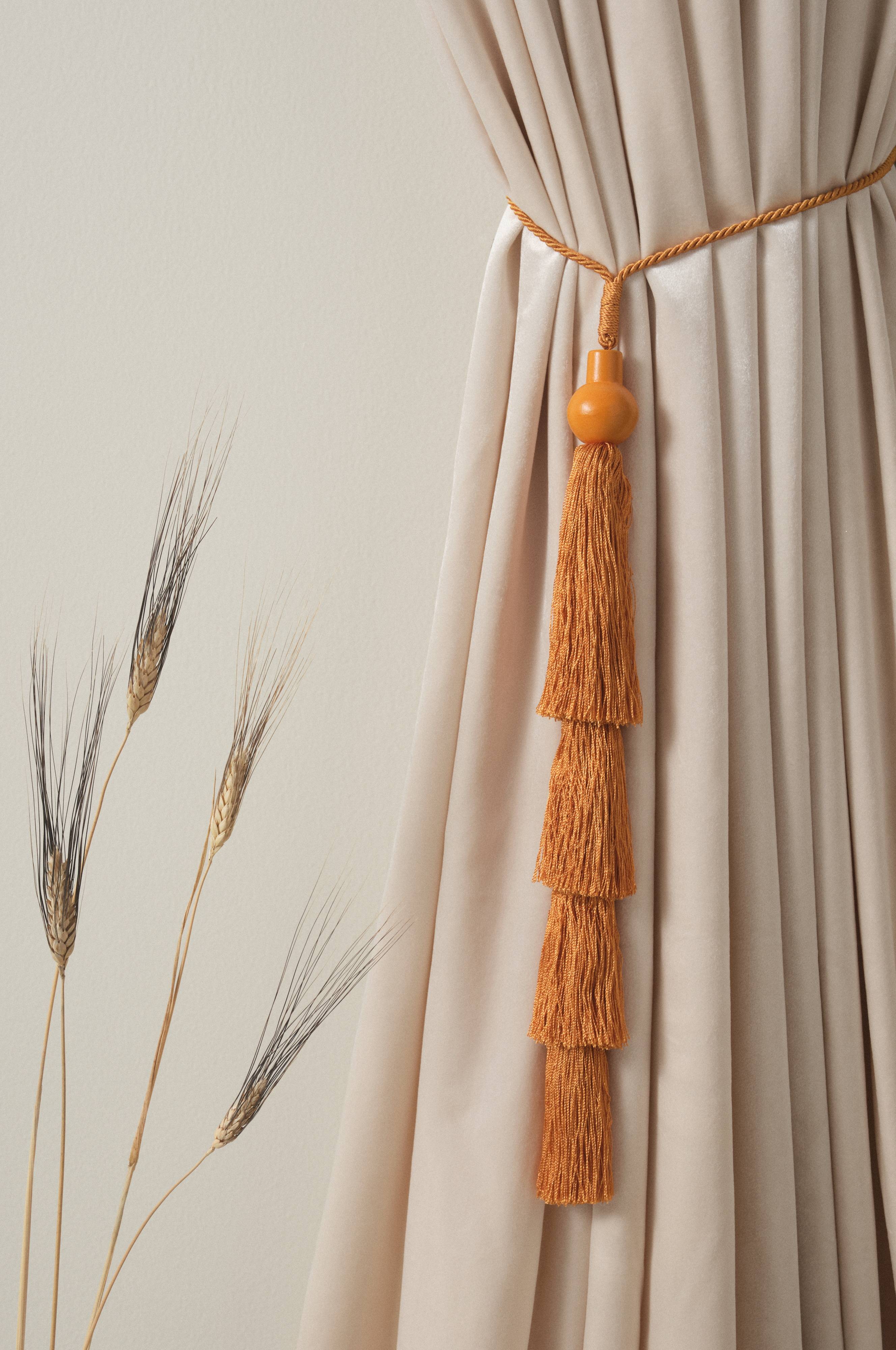 1-pack tofsomtag av polyester med litet inslag av bomull. NURU är ett läckert, enfärgat tofsomtag med tofs i fyra etage med matchande dekor av järn i toppen av tofsen. Tofsomtaget hjälper dig att få en fin gardinuppsättning.