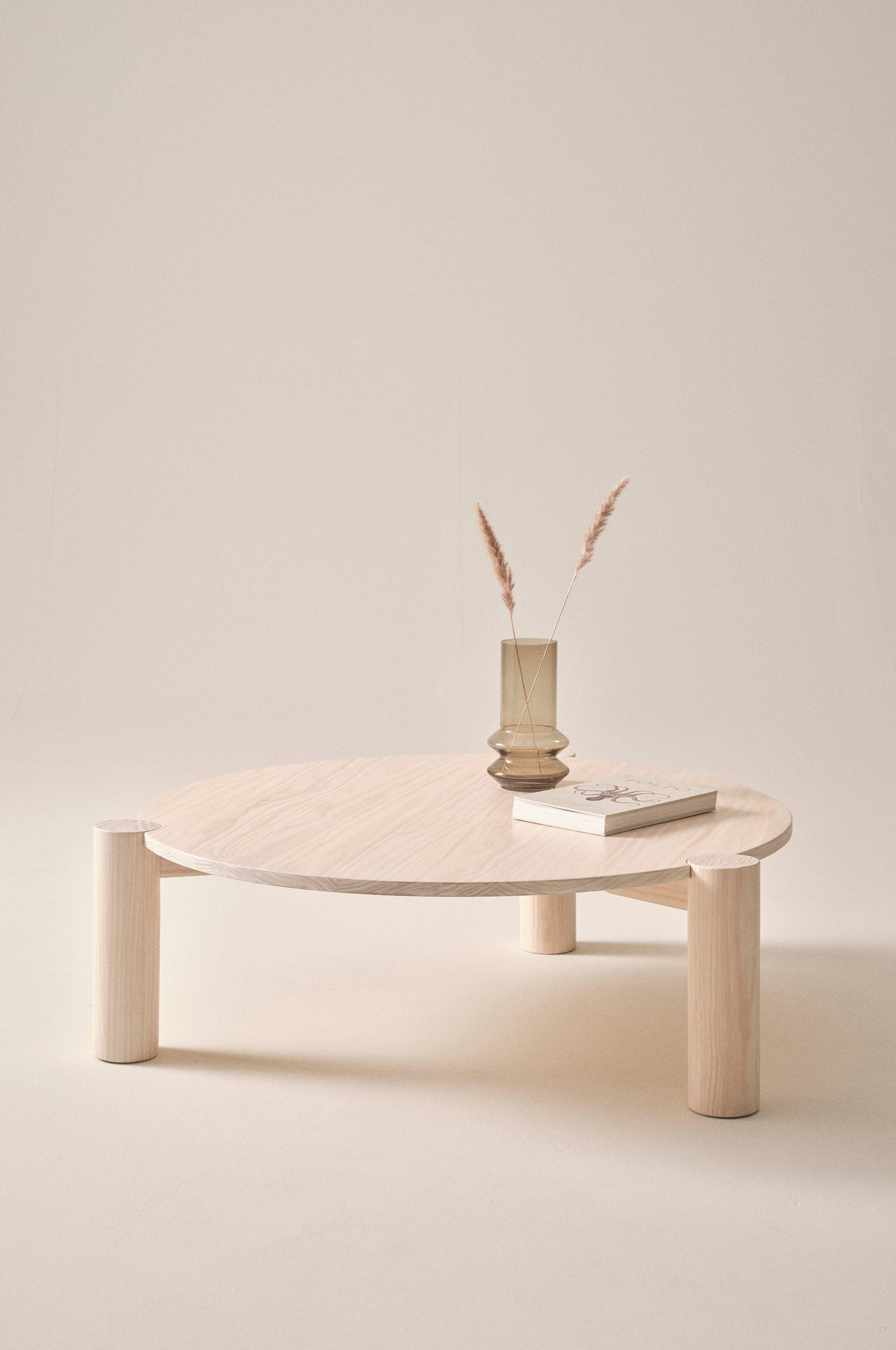 Runt soffbord i massiv, FSC-märkt furu. Du kan välja mellan svarbrun lack och vitsåpad yta som sedan lackats vilket ger vacker lyster. Bordet har en unik design med rejäla, runda, utanpåliggande ben som fällts in i bordsskivan. Träets ådring ger en härligt naturlig känsla. Viss montering krävs. Monteringsanvisning medföljer.