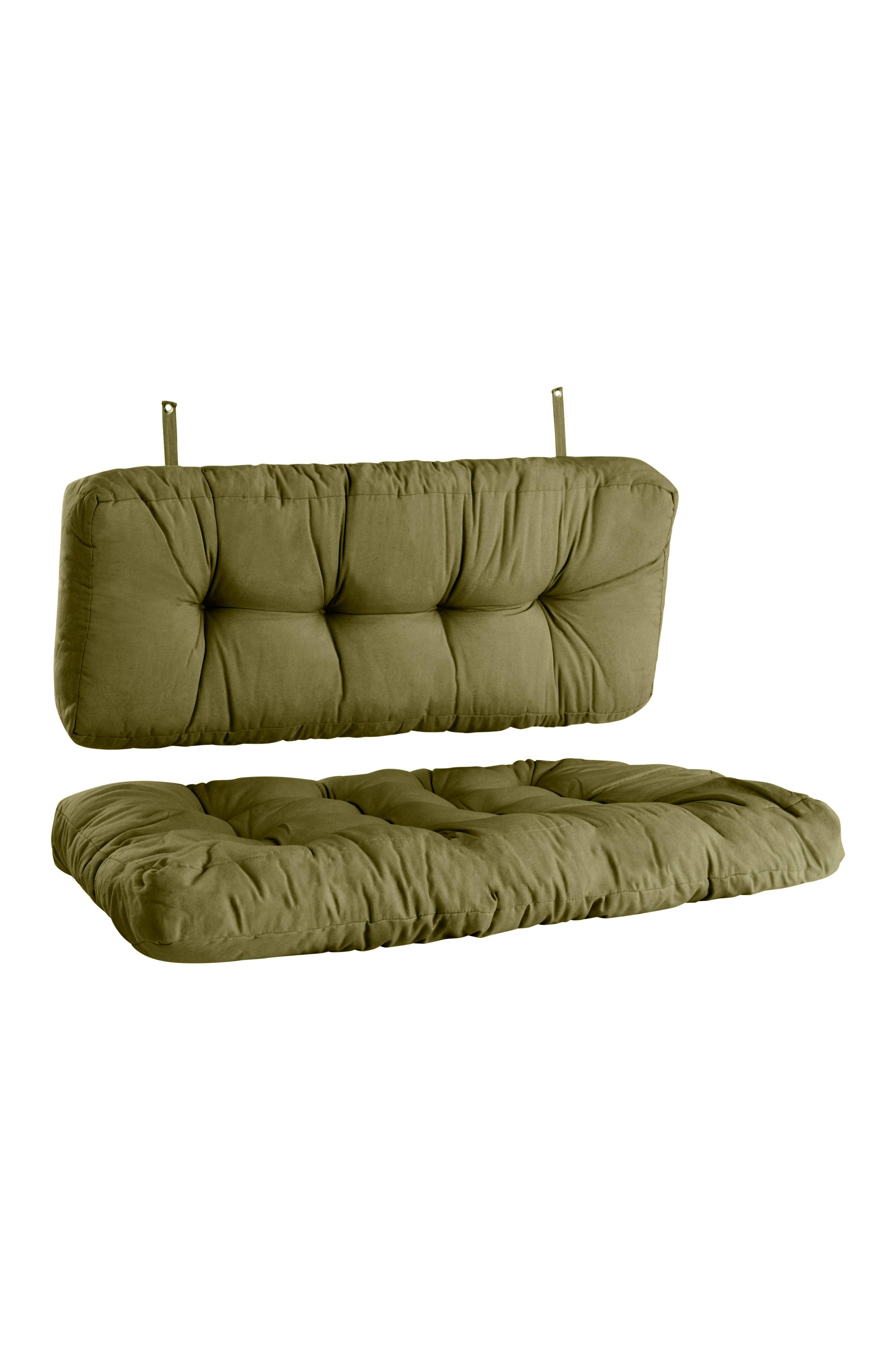 Dynset till utemöbler. Setet innehåller en sittdyna och en ryggkudde och de är anpassade för möbler som tillverkats av lastpallar (typen Eur-pall). Dynorna har klädsel av bomull, polyester och återvunnen fiber som stoppats med flockfyllning. För att fixa en sitthörna av lastpallar behöver du inte vara särskilt händig och med ett praktiskt dynset som passar blir det nästan för enkelt för att vara sant.