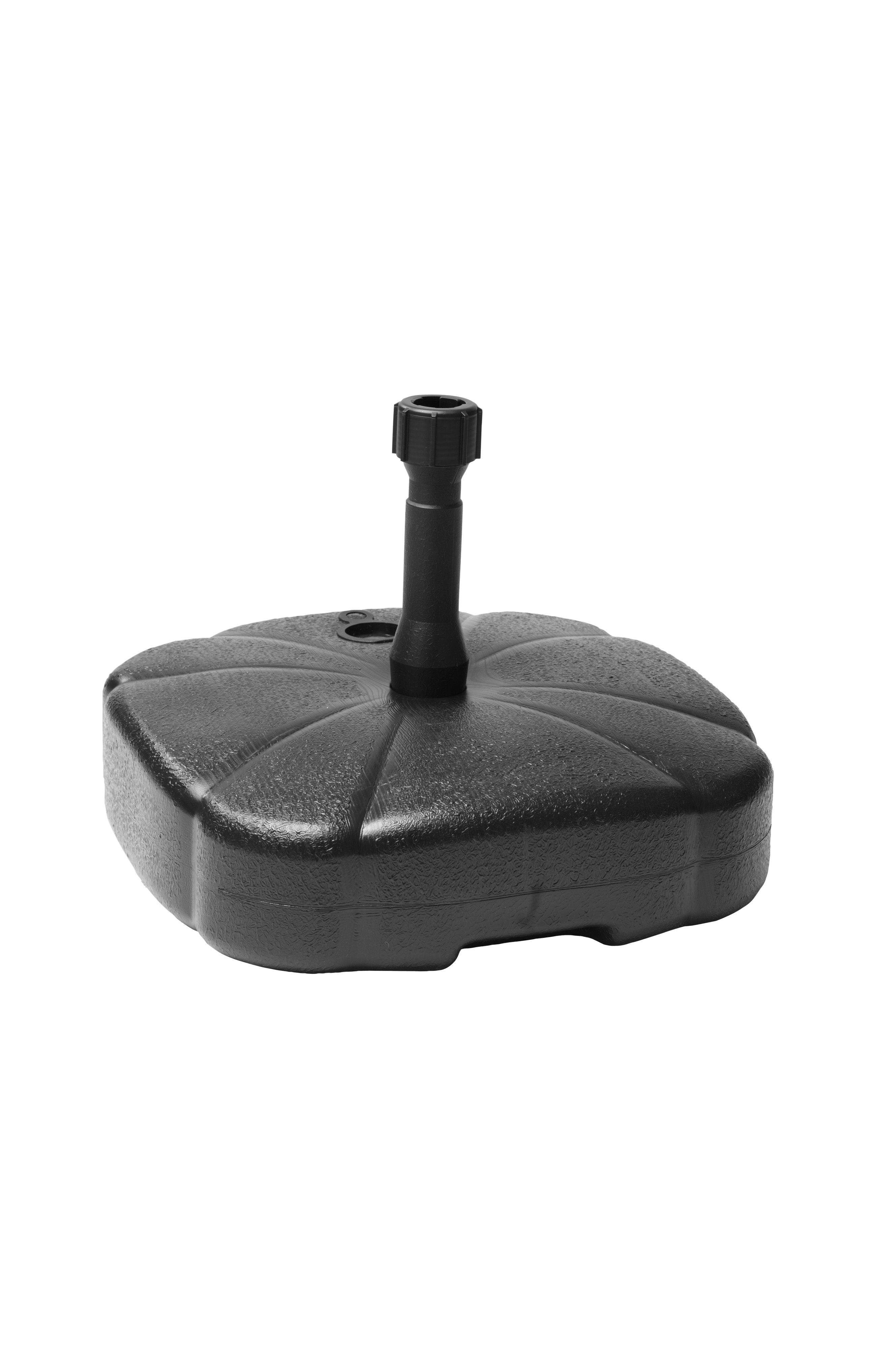 Parasollfot i plast. Kan fyllas med vatten eller sand. Diametern i röret kan justeras till mellan 20 och 28 mm.