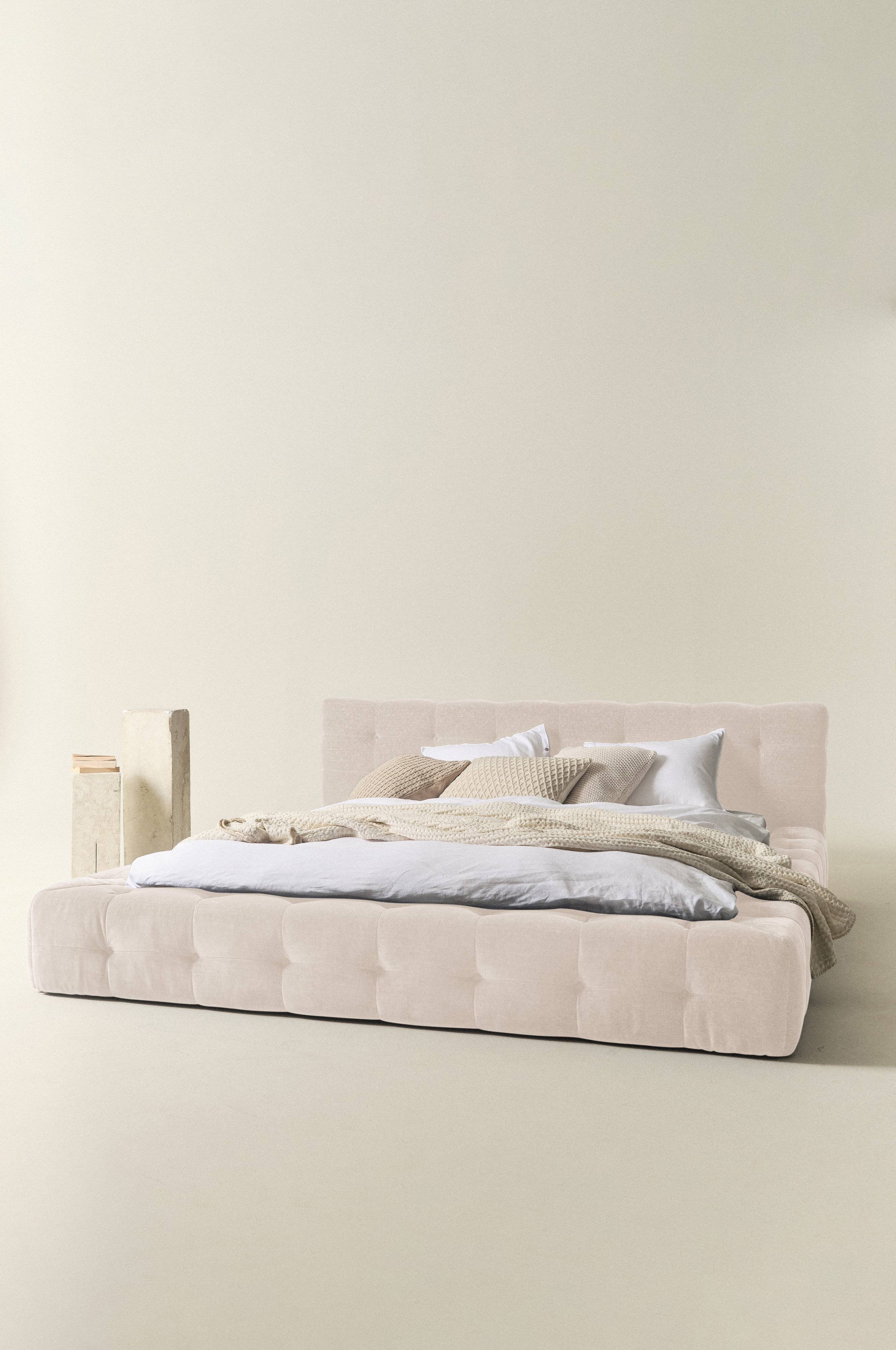 Sängram som är härligt inbjudande och mycket generös i formen. Både huvudgaveln och ramen runt om är mjukt vadderad och klädd med ett mjukt chenilletyg av polyester som har djuphäftade knappar. Sängen är lyxig och elegant. Ramen runt sängen går nästan ända ned till golvet, bara en liten luftspalt lämnas som gör att luften kan cirkulera under sängen. Stommen är tillverkad av FSC-certifierad furu och plywood. Sängramen har ribbotten av plywood och du kompletterar med madrasser eller resårmadrasser beroende på vilket du föredrar.