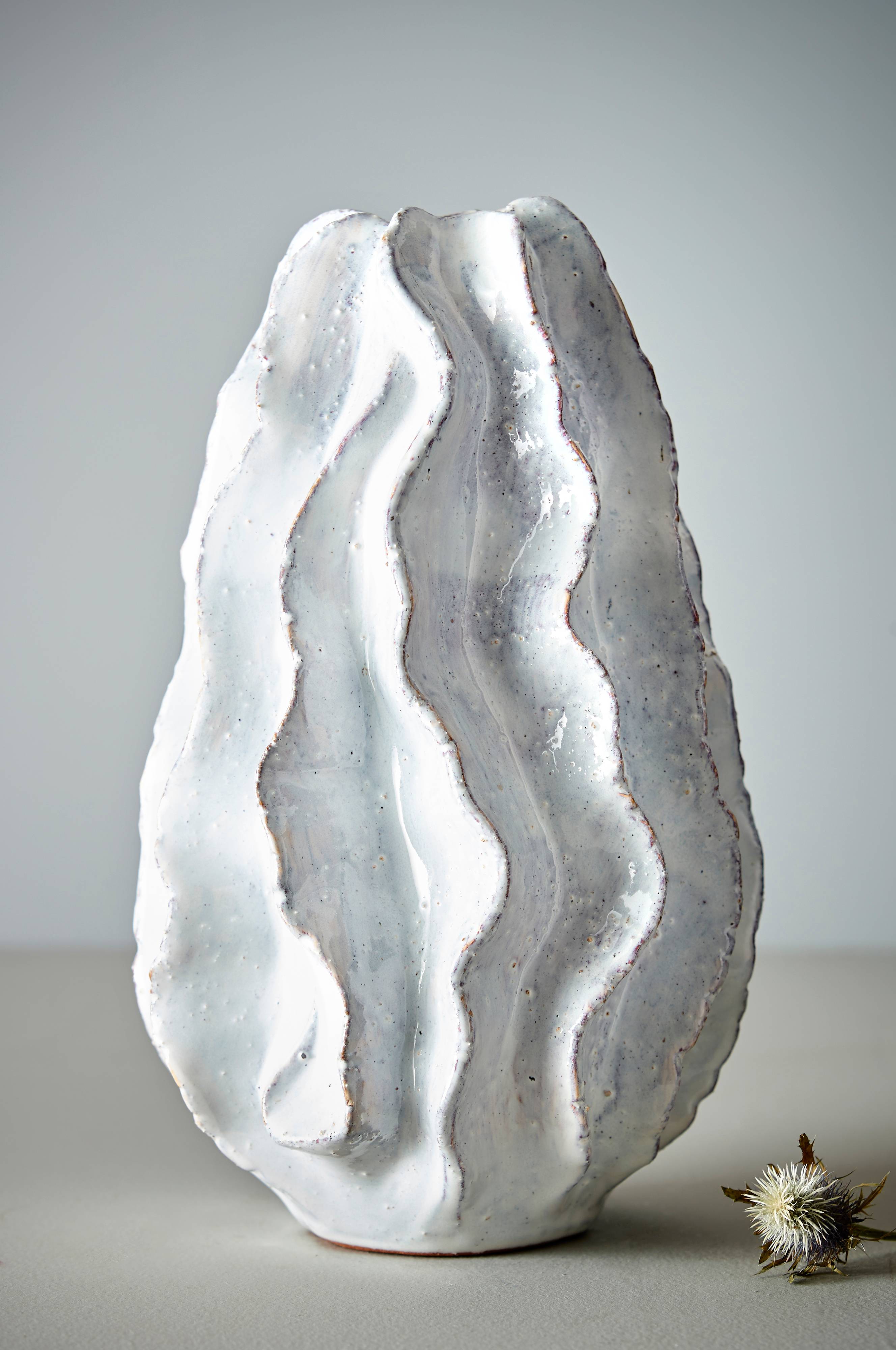 Havet inspirerar. PEYTON är en handgjord och vacker vas i böljande form som påminner om havets koraller och den fina glasyren för tanken till musslornas pärlemorfärg med en fantastiskt skimrande lyster.