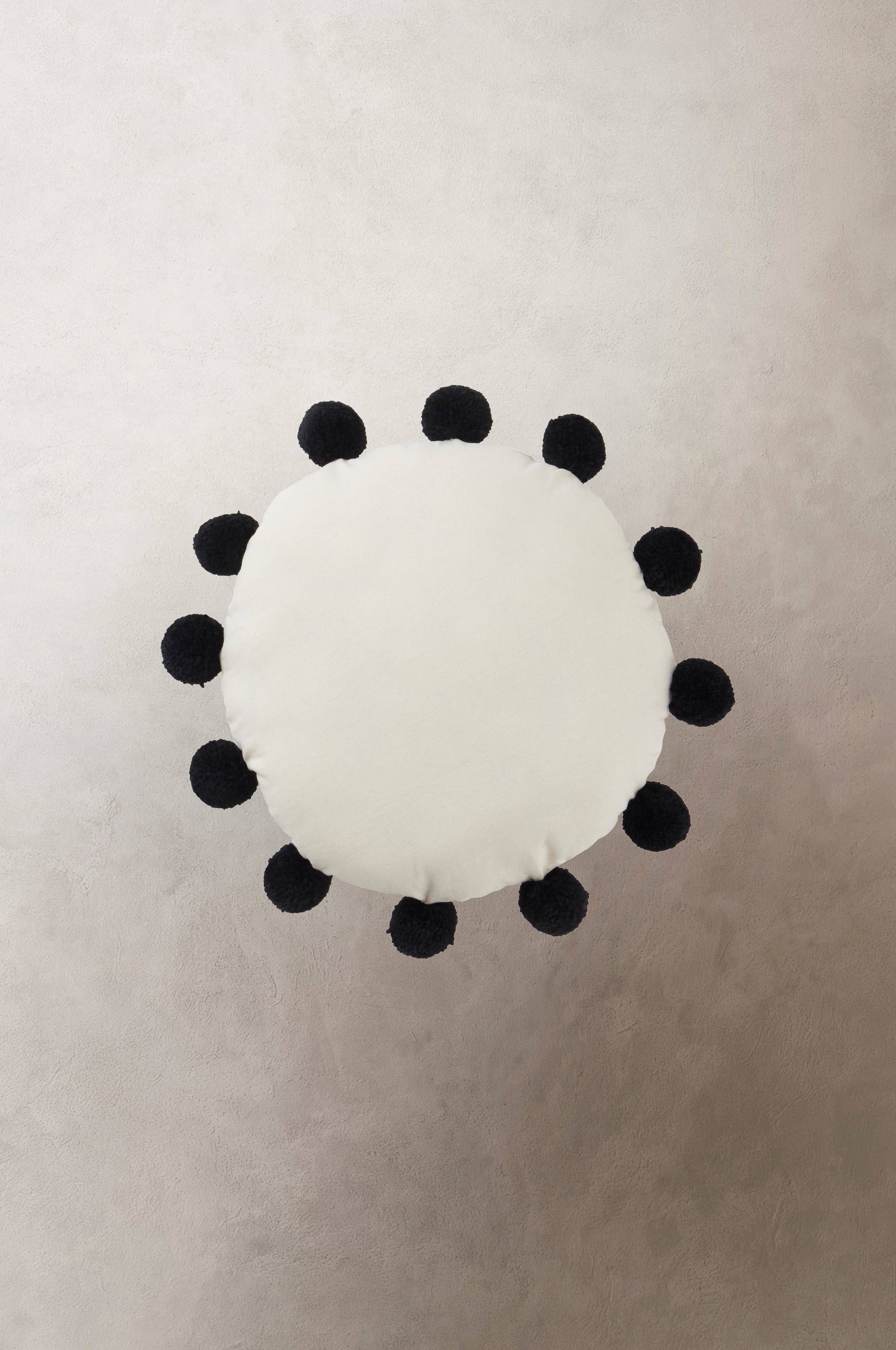 1-pack rund kudde i canvas av bomull med dekorativa garnbollar runt kanten. Kudden har mjuk stoppning av polyester. Baksidan är enfärgad i samma tyg som framsidan.