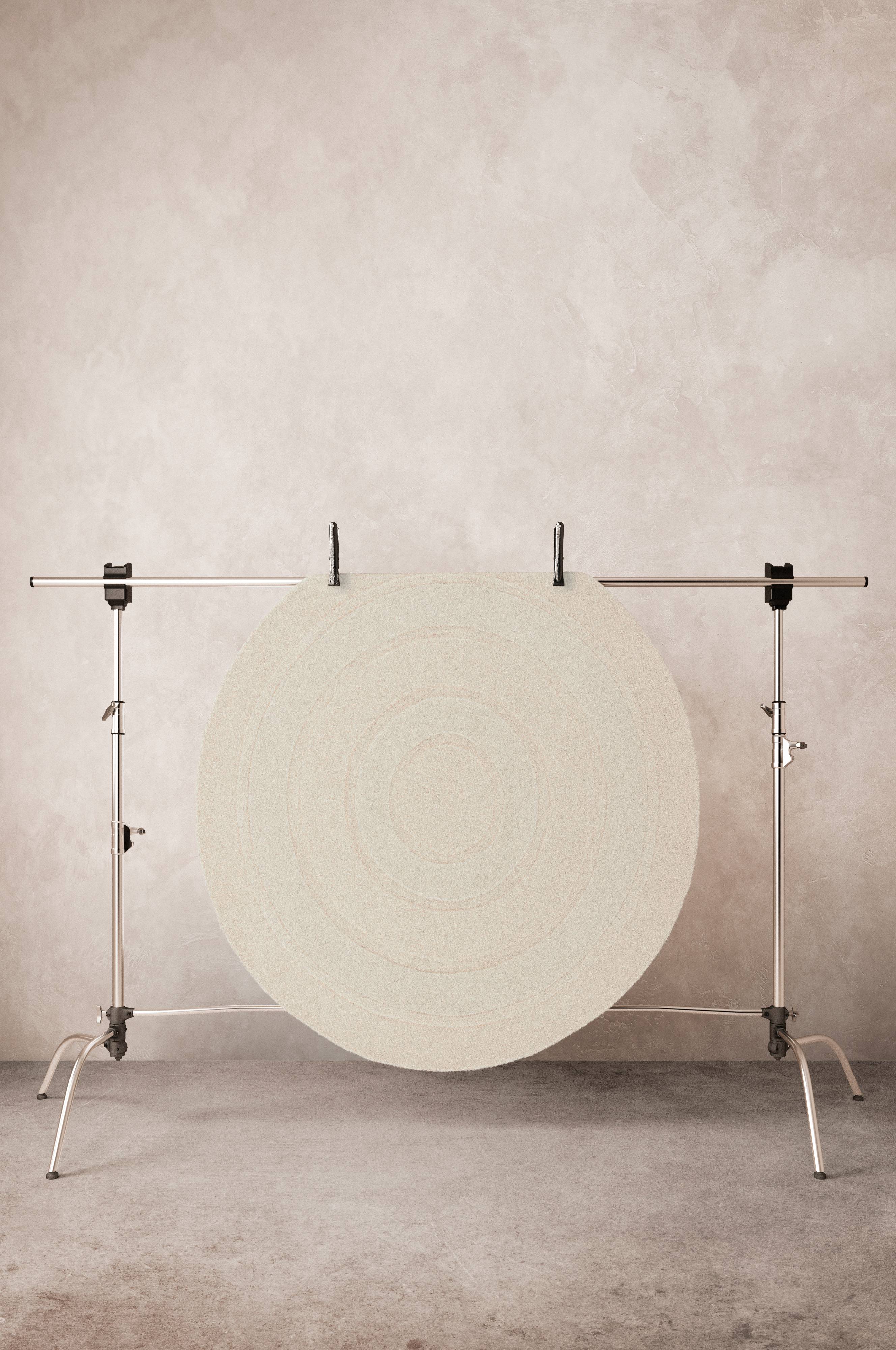 Rund, handtuftad ullmatta med cirkelmönster som skapats av olika höjd på luggen och olika vävteknik. Den tätvävda mattan har klippt lugg kombinerat med vävda öglor. En handgjord matta är ett fint hantverk och varje matta är unik. Lugghöjd öglor 0,5-0,6 cm, klippt lugg 1-1,2 cm. Tjocklek 1,8-2 cm. 3000-3200 g/m².