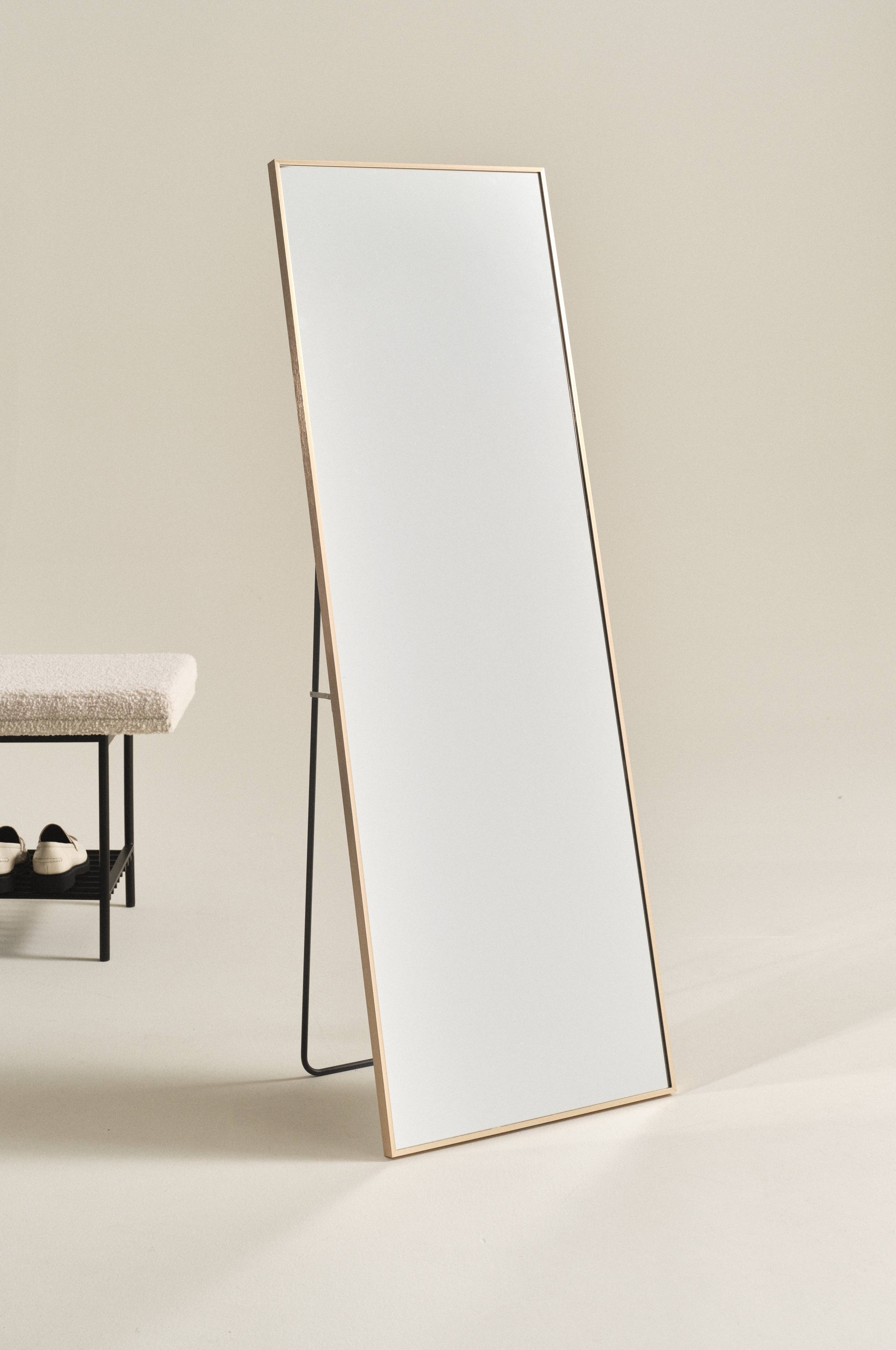 Högsmal, rektangulär spegel med smäcker aluminiumram. Spegeln har ett stativ som gör den fristående och den lutar lite lagom. Spegeln kan också lutas mot en vägg. Baksidan är av MDF.