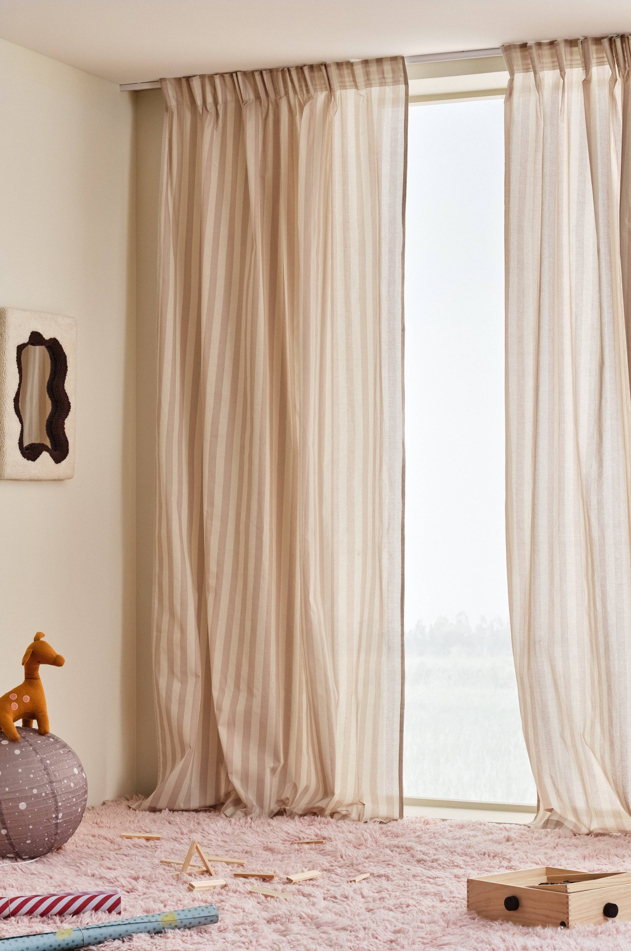Två gardinlängder i bomull med tryckta ränder. Randigt är klassiskt och alltid modernt, ett mönster som är lätt att matcha med andra mönster. Längderna har påsytt multifunktionsband och kan hängas upp med fingerkrokar, kanal samt dold hälla.