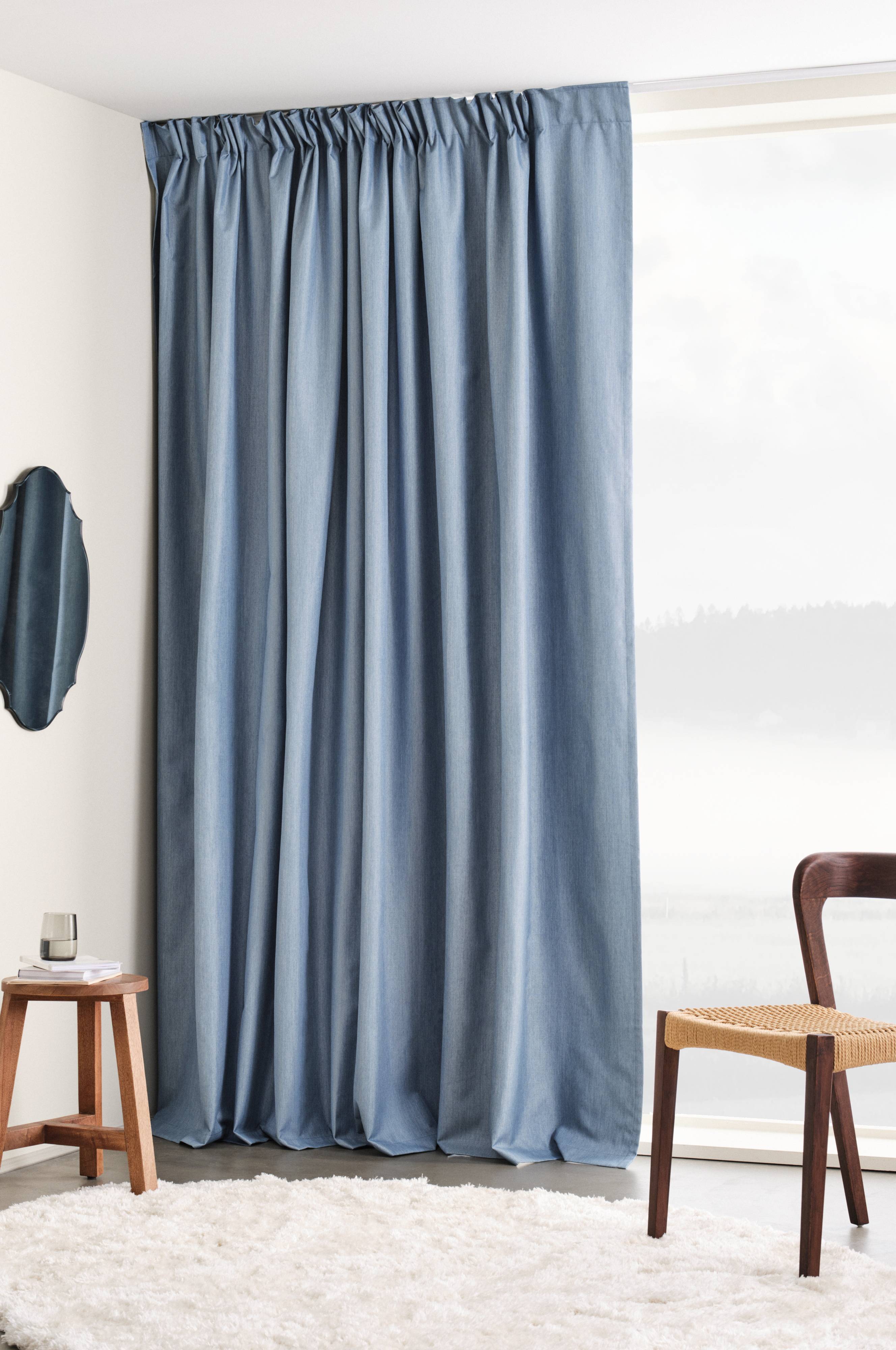 En gardinlängd i polyester med påsytt multifunktionsband och mörkläggande baksida. Stäng ute ljuset när du vill. Mörkläggningsgardinen har struktur, matt yta och samtidigt lyster i trådarna vilket skapar en unik känsla i rummet. Multifunktionsbandet ger dig möjligheten att variera din upphängning med rynkband, dold hälla eller veckband.
