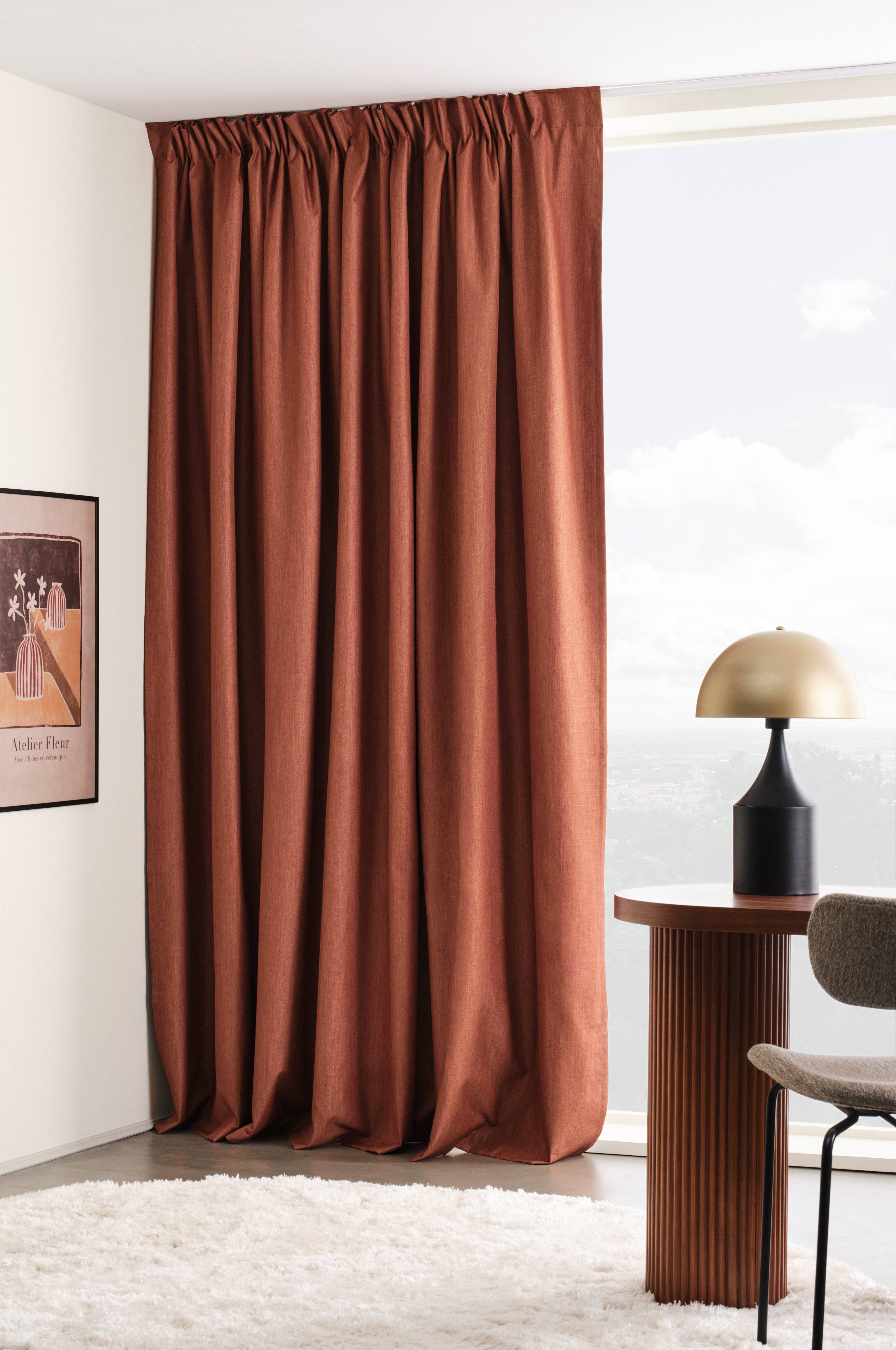 En gardinlängd i polyester med påsytt multifunktionsband och mörkläggande baksida. Stäng ute ljuset när du vill. Mörkläggningsgardinen har struktur, matt yta och samtidigt lyster i trådarna vilket skapar en unik känsla i rummet. Multifunktionsbandet ger dig möjligheten att variera din upphängning med rynkband, dold hälla eller veckband.