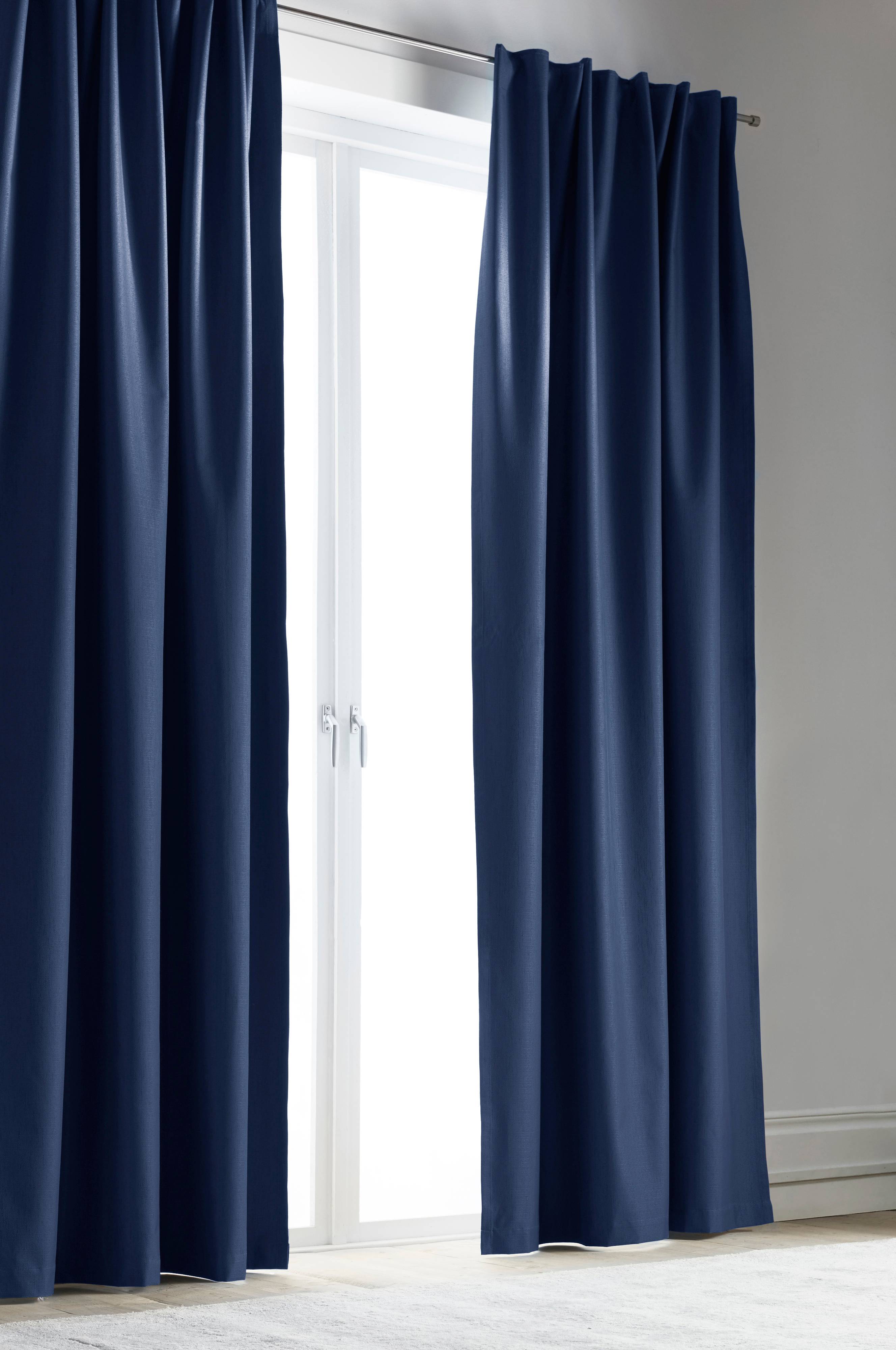En gardinlängd i polyester med påsytt multifunktionsband. Stäng ute ljuset när du vill. Mörkläggningsgardinen har struktur, matt yta och samtidigt lyster i trådarna, vilket skapar en unik känsla i rummet. Ljusblockerande beläggning på baksidan. Multifunktionsbandet ger dig möjligheten till att variera din upphängning med rynkband, dold hälla och veckband.