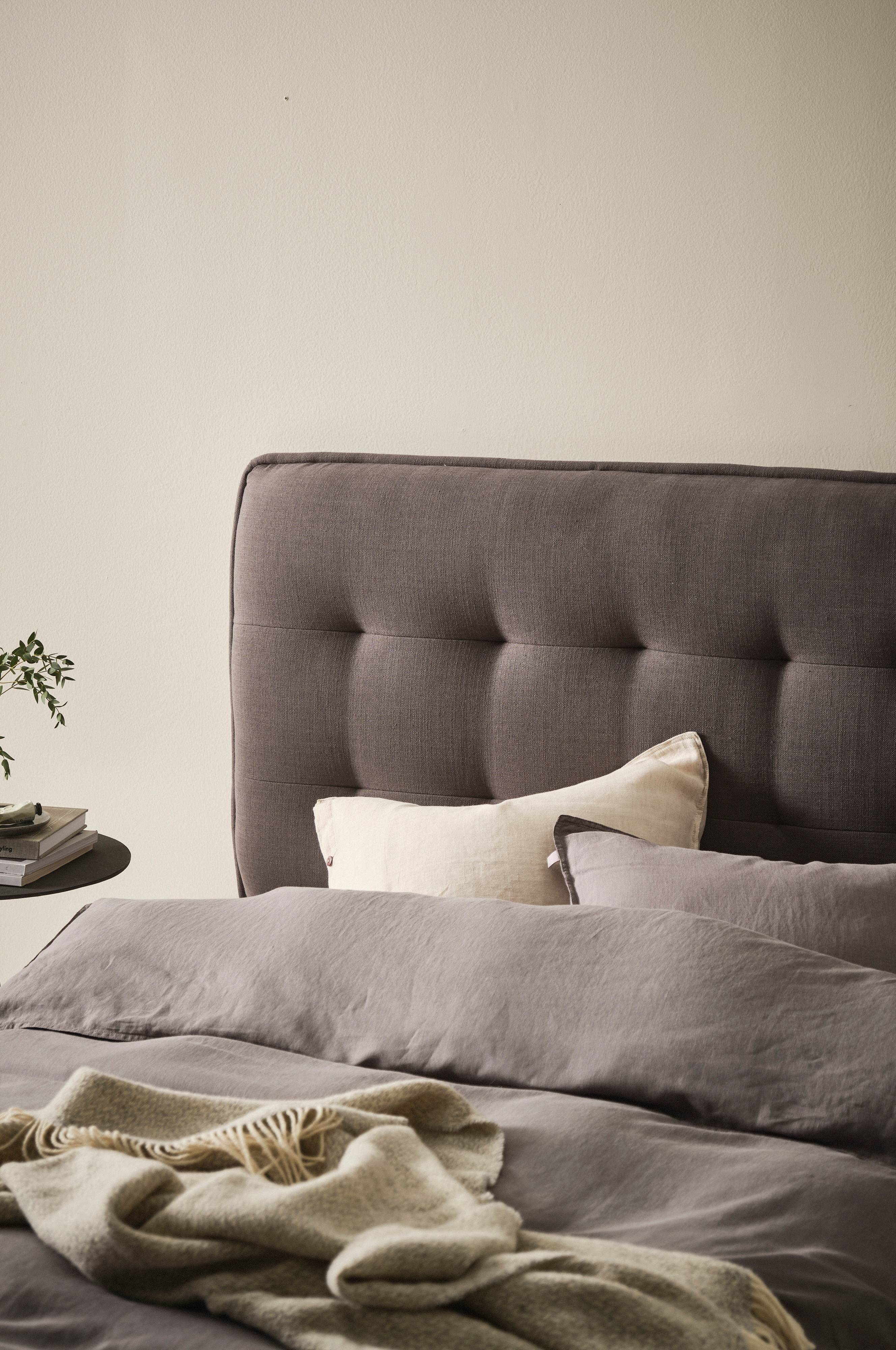Sänggavel med tyg av lin och polyester som har en skön linnekänsla. Stommen är tillverkad i FSC-certifierat massivt trä och plywood. Den inbjudande sänggaveln har mjuk, tjock vaddering med dekorativa, djuphäftade knappar och en liten vinge runtom. Klädseln är slitstark med Martindale på 30000. ROSARIO blir ett bekvämt ryggstöd om du vill ta morgonkaffet sittandes i sängen. Den fristående sänggaveln placeras mellan resårmadrassen och väggen. Väggfäste medföljer.