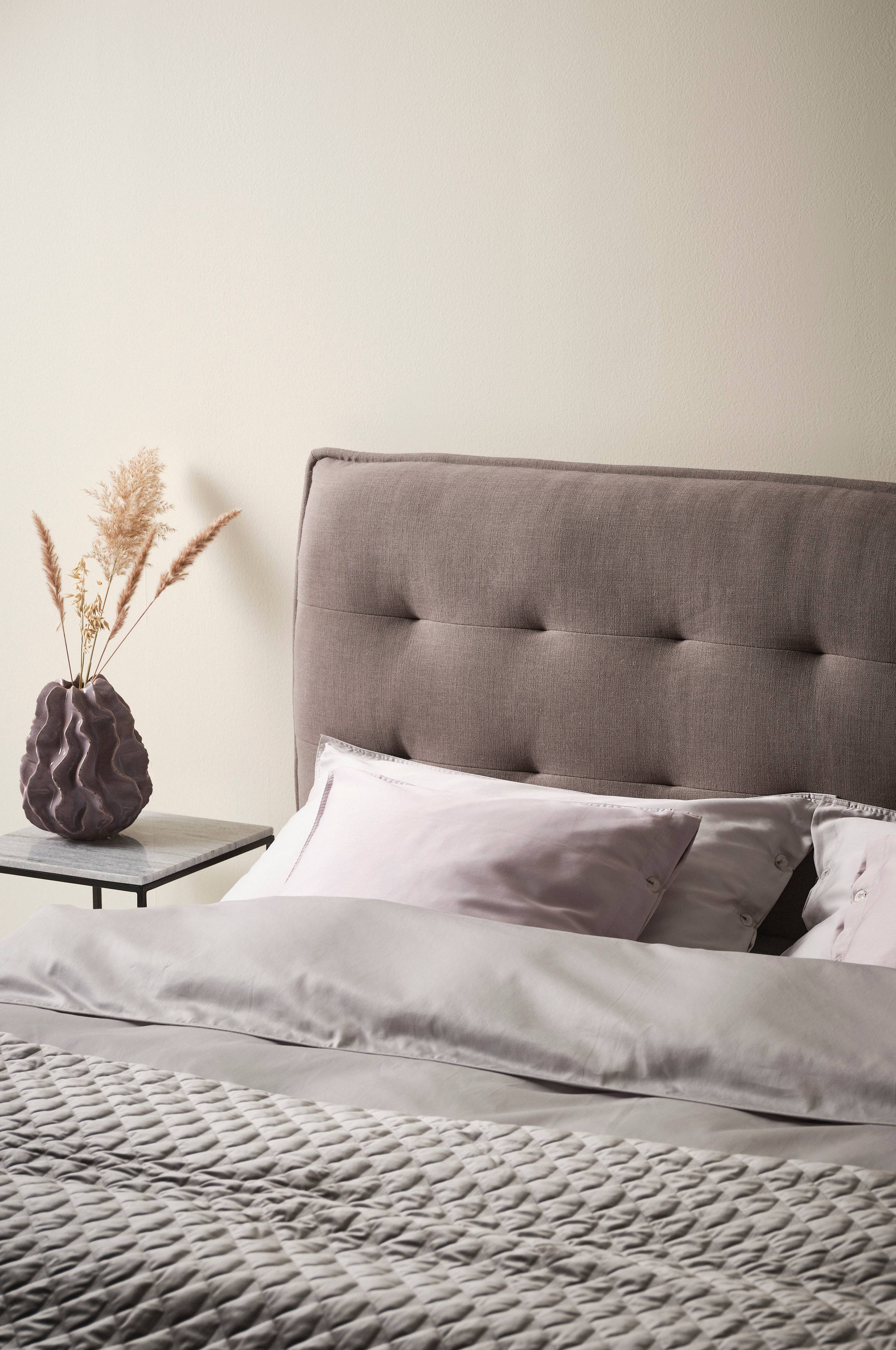 Sänggavel med tyg av lin och polyester som har en skön linnekänsla. Stommen är tillverkad i FSC-certifierat massivt trä och plywood. Den inbjudande sänggaveln har mjuk, tjock vaddering med dekorativa, djuphäftade knappar och en liten vinge runtom. Klädseln har Martindale på 30000. ROSARIO blir ett bekvämt ryggstöd om du vill ta morgonkaffet sittandes i sängen. Den fristående sänggaveln placeras mellan resårmadrassen och väggen. Väggfäste medföljer.