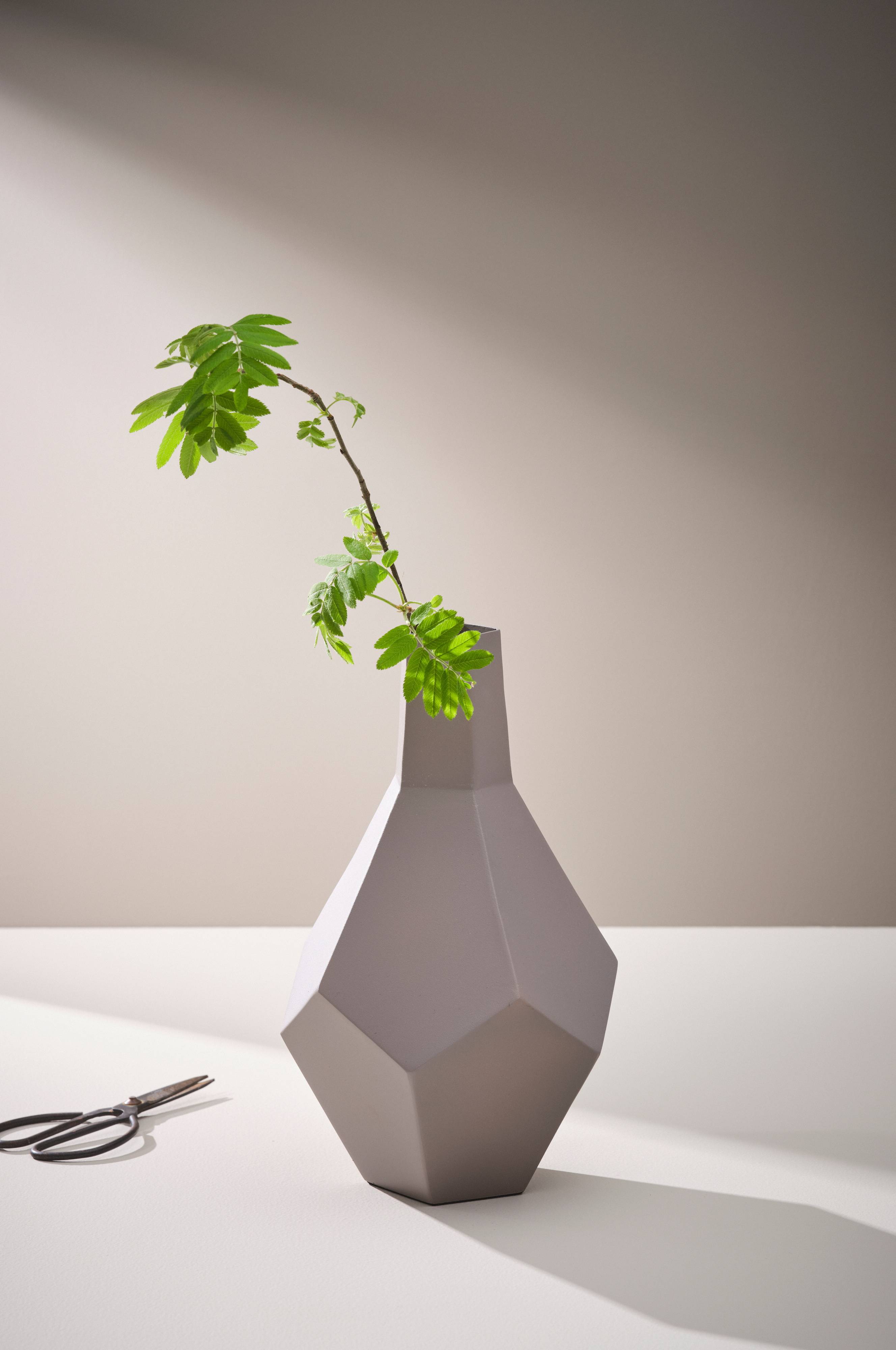 Vas av järn med matt finish. Vasen är originellt kantig och ändå rund i modellen, snygg när den får exponera färgglada blommor, gröna kvistar och även dekorativ helt tom.
