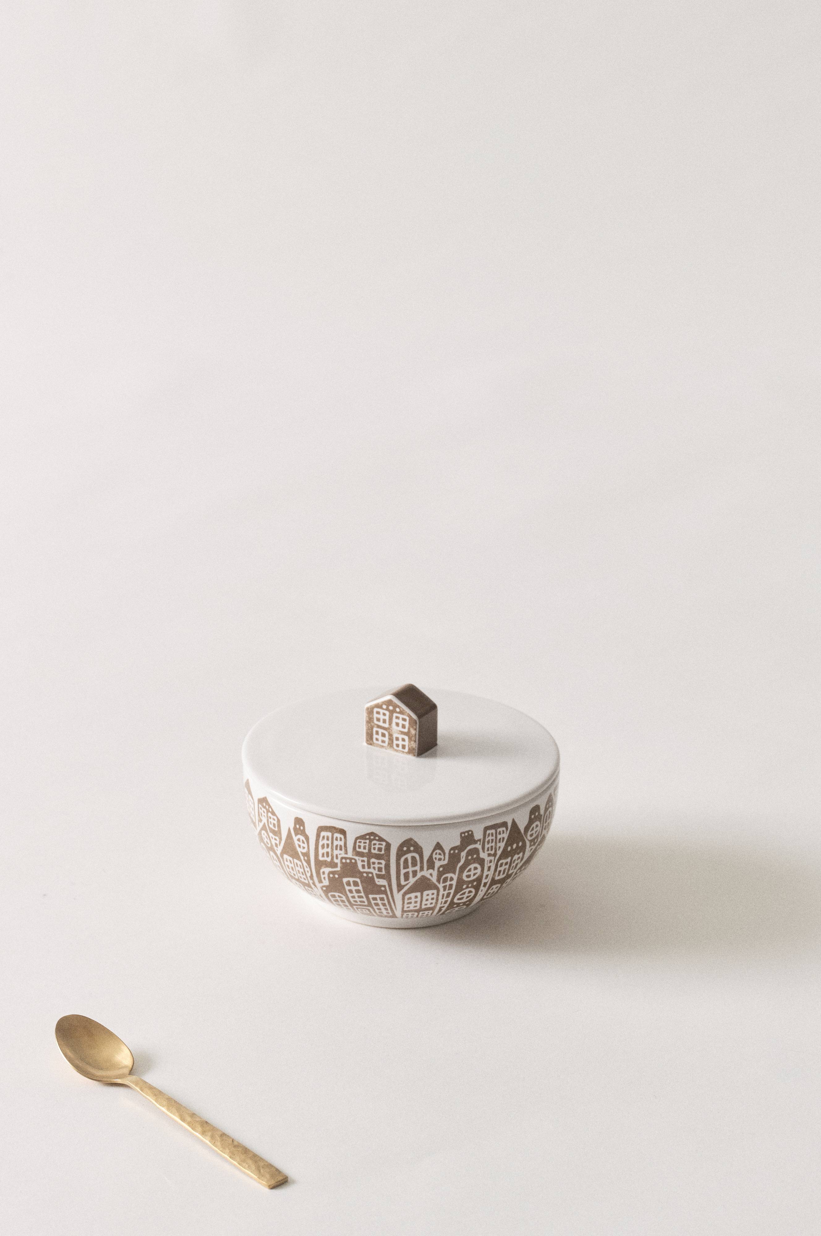 Skål med lock, båda delarna är av dolomitporslin. Skålen har ljuvlig dekor av naivistiskt målade hus som matchas av knoppen på locket, ett litet sött hus. Skålen har skön retrokänsla och passar till allt från en god nötblandning till hårsnoddarna eller spännande småsaker.