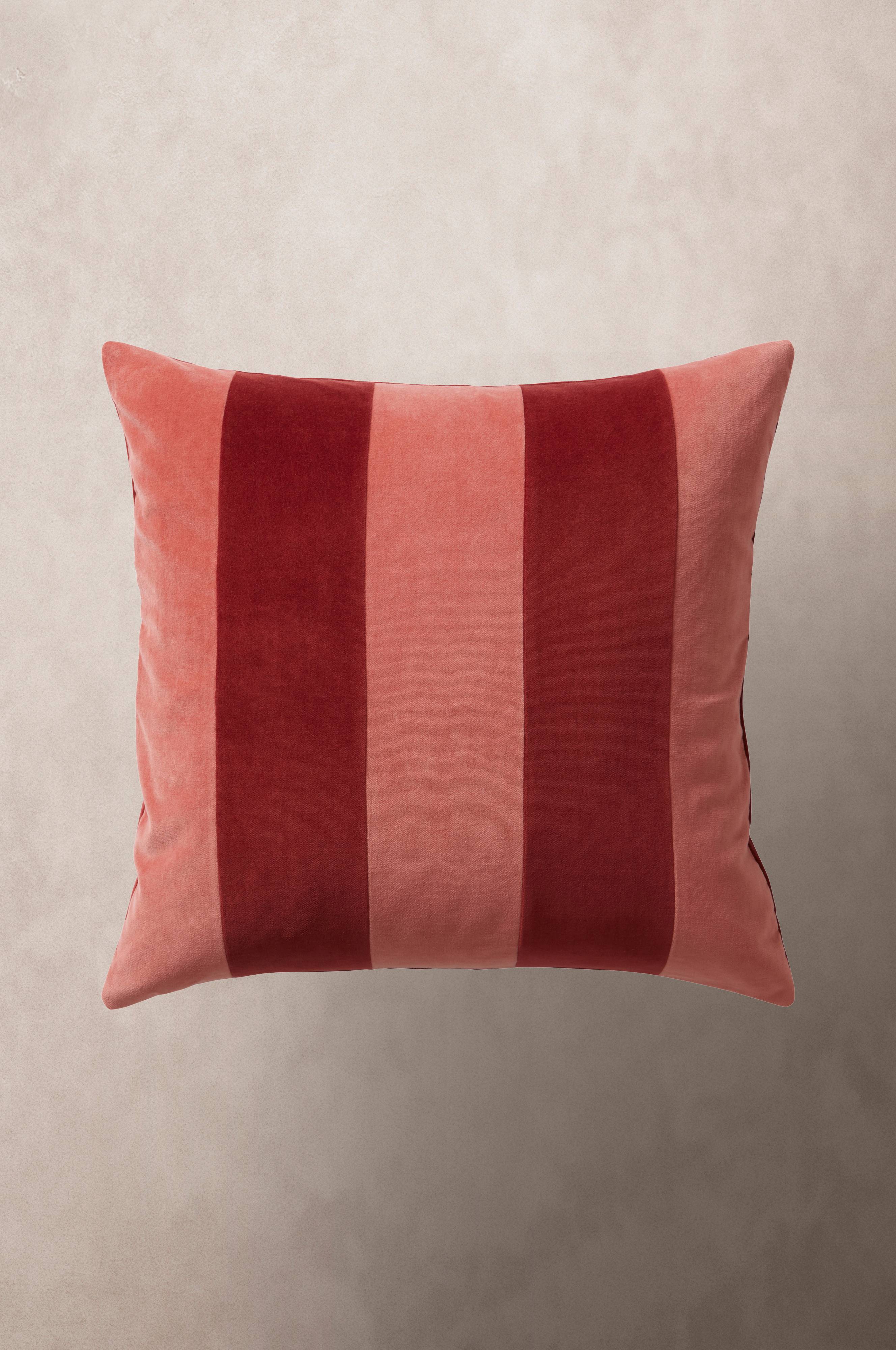 1-pack kuddfodral i mjuk sammet av bomull med matt yta. Framsidan på kuddfodralet är sytt i lapptäcksteknik och blockränderna är i väl valda nyanser. Sammetstyget har fin lyster och ränderna skimrar i vackra nyanser med ljuset, tyget är tvättat för extra mjuk känsla. Baksidan är enfärgad i en av rändernas kulör. Dold dragkedja på baksidan. Kuddfodralet är fodrat med mikrofiber av polyester. Tygets gramvikt 230 g/m².