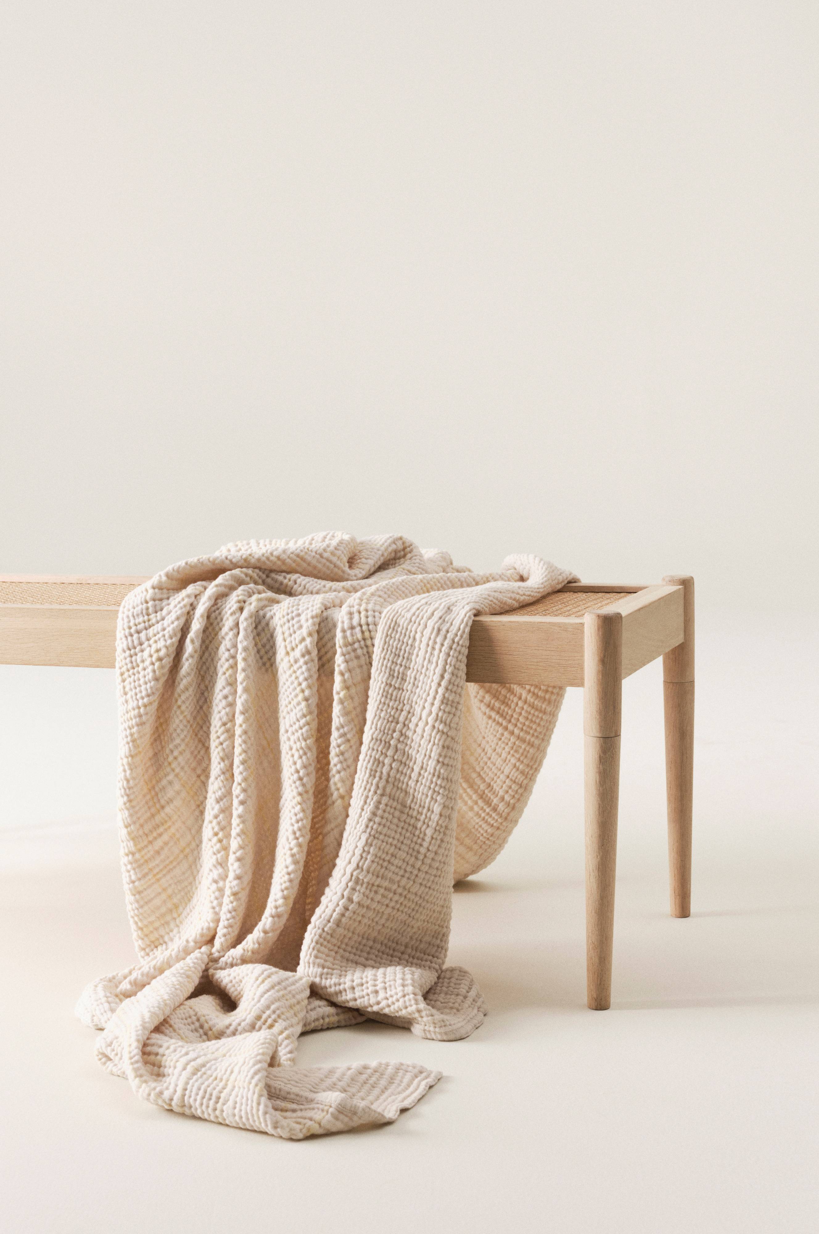 RUTHY är en härlig och luftig pläd i muslinkvalité av bomull med bandkant runt om. Muslin är en behaglig kvalité som vävts i flera lager, RUTHY är fyralagers och blir bara mjukare ju mer den används. Pläden är garnfärgad vilket innebär att garnet färgats innan vävning och pläden har rutig struktur. RUTHY är alldeles lagom tjock och värmer skönt, mycket tack vare luften som skapas i den speciella vävtekniken, gramvikt 210 g/m².