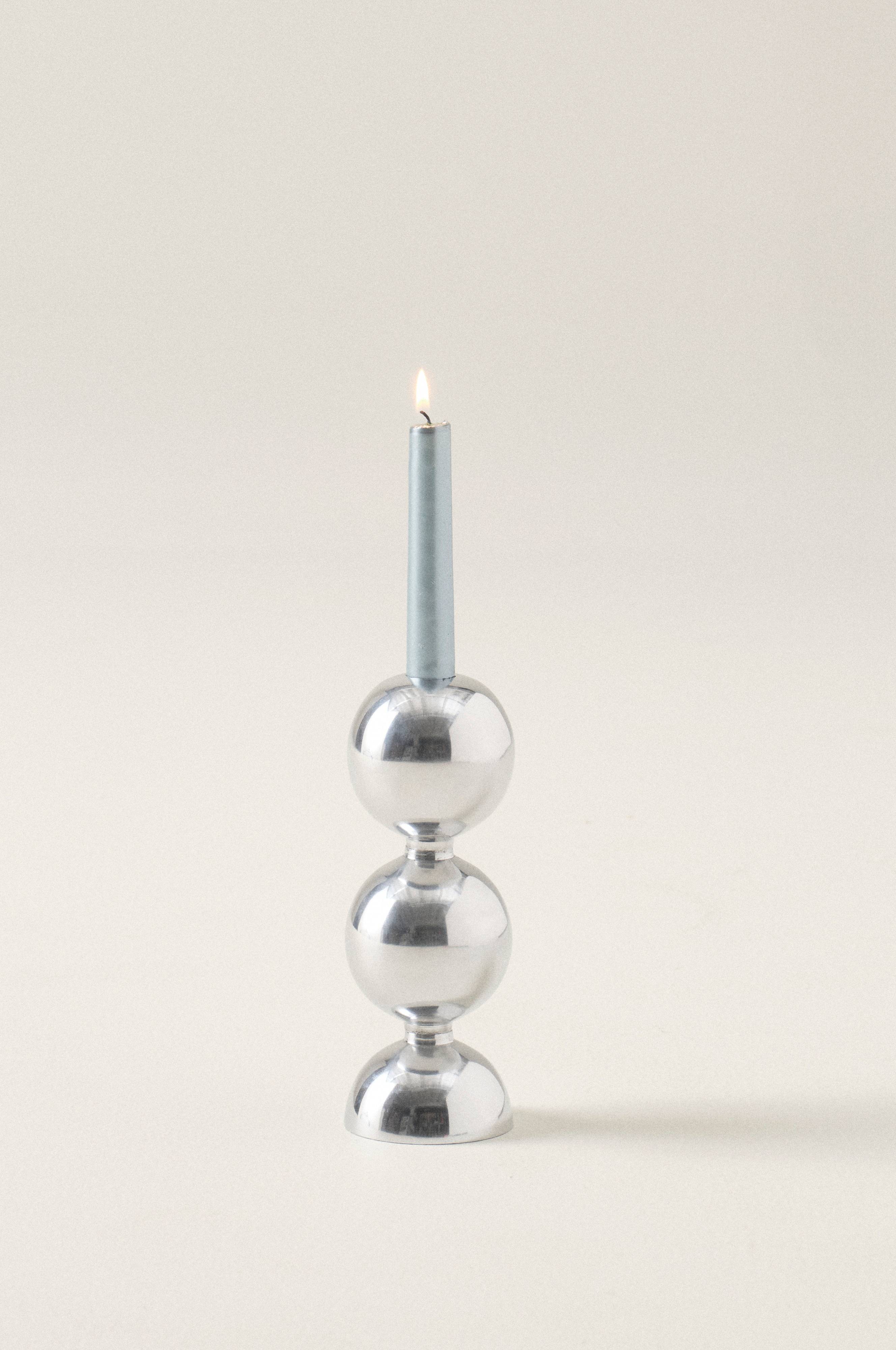 Ljusstake av aluminium som byggts upp av två hela runda klot och ett halvt, därav namnet. Ljusstaken är kromad med polerad och blank lyster. Ljus medföljer ej.
