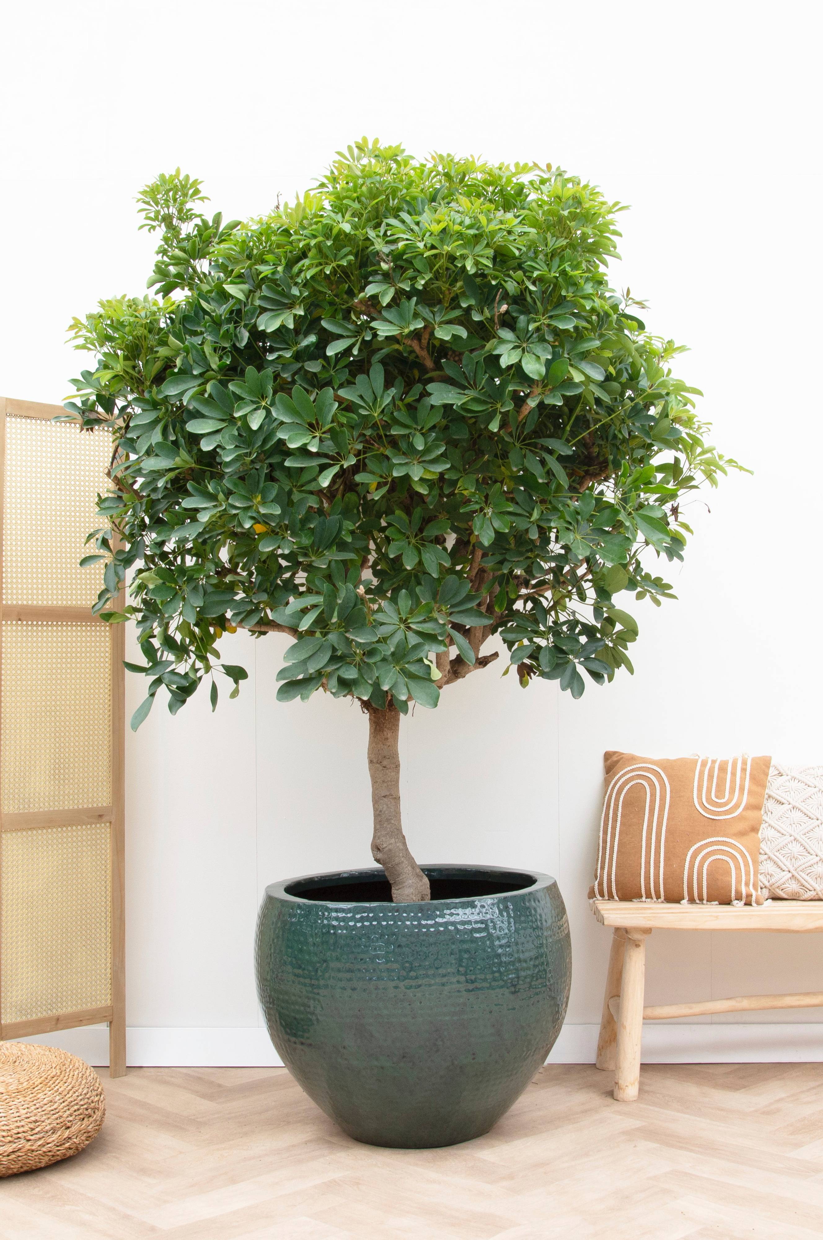 Schefflera på stam kommer från Australien och att den är mer likt ett rumsträd än en växt, vilket gör den populär att sätta i hemmet och på arbetsplatsen. Att den är lättskött och luftrenande gör inte saken sämre. Scheffleran föredrar en ljus plats och lätt fuktig jord. Att regelbundet spraya bladen med vatten kommer också att ha en positiv effekt på växten, förutom att det tar bort damm från bladen och låter solljus nå krukväxten bättre, har det en förebyggande effekt mot mjölbaggar och andra skadedjur. Saven som kommer från stjälken och bladen är milt giftig. Höjd 250 cm. Krukdiameter 50 cm. Ytterkruka ingår ej. Doft: ingen.