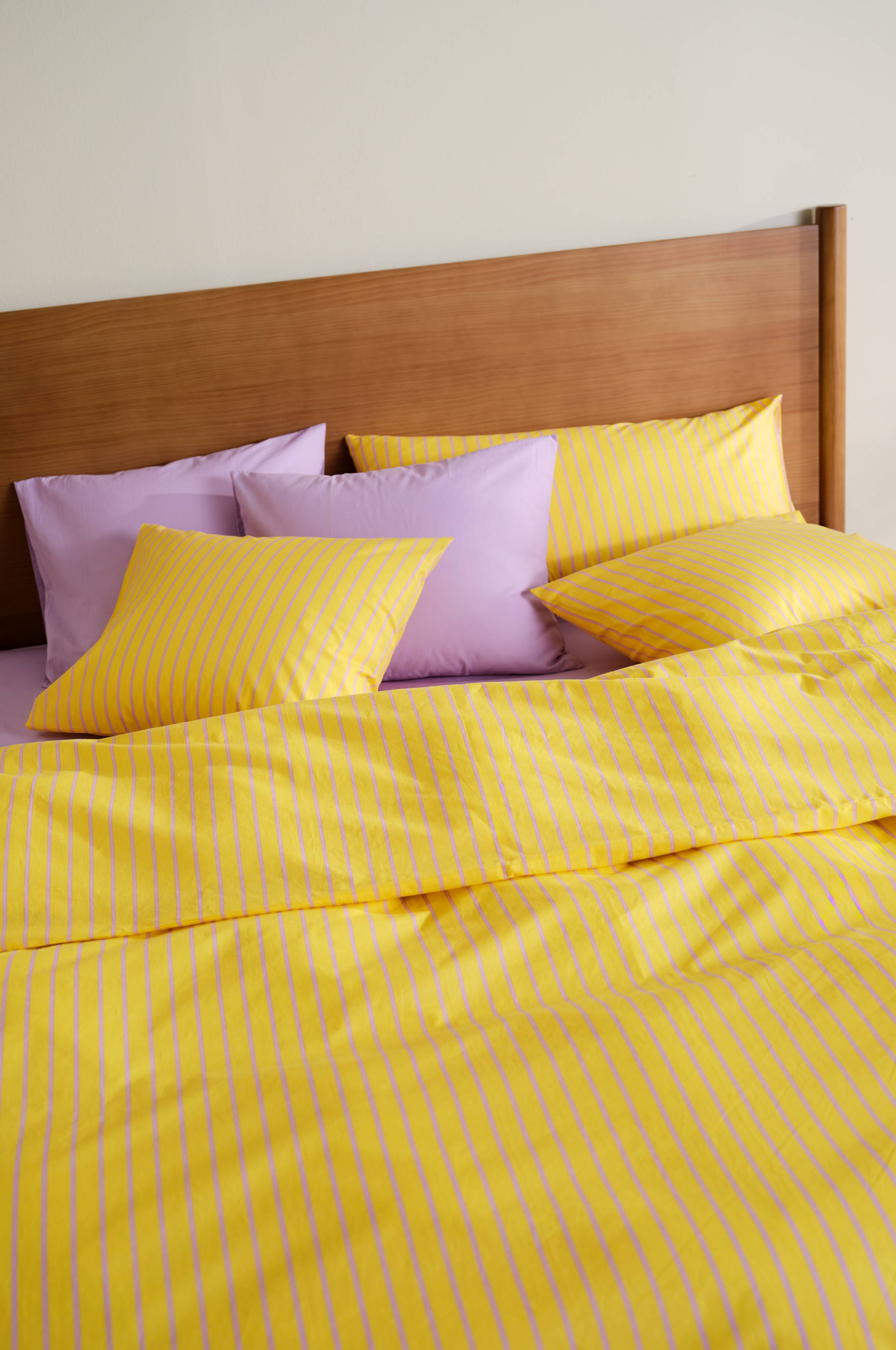 SIMA bäddset tillverkat av ekologisk bomull. En lyxig komfort med extra brett påslakan. Tryckta ränder i krispiga färger. Praktiska handhål för täcket. Förvandla ditt sovrum till en vilsam plats.
