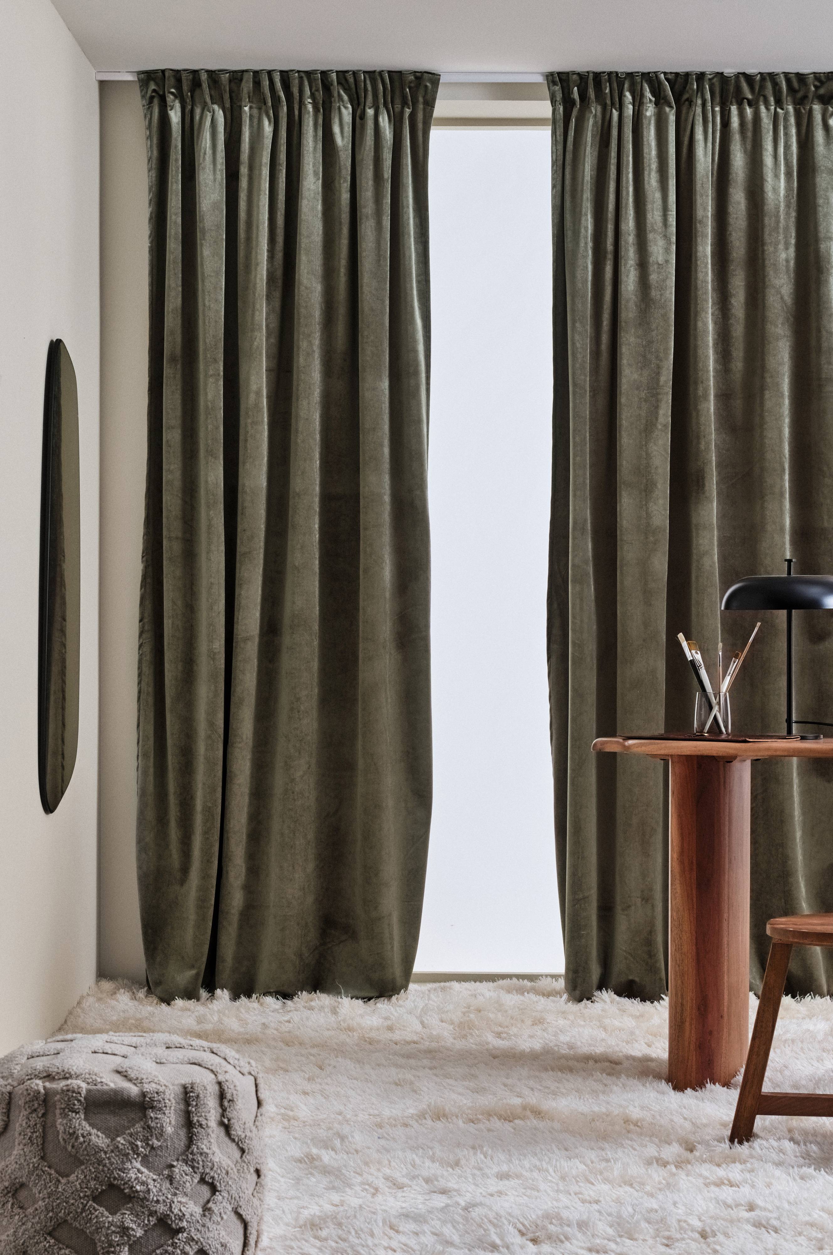 Två gardinlängder i elegant sammet av polyester. Sammetstyget skimrar vackert, färgnyansen upplevs olika beroende på hur ljuset faller. Längden har påsytt multifunktionsband. Gardinen kan hängas upp med fingerkrokar, kanal samt dold hälla.