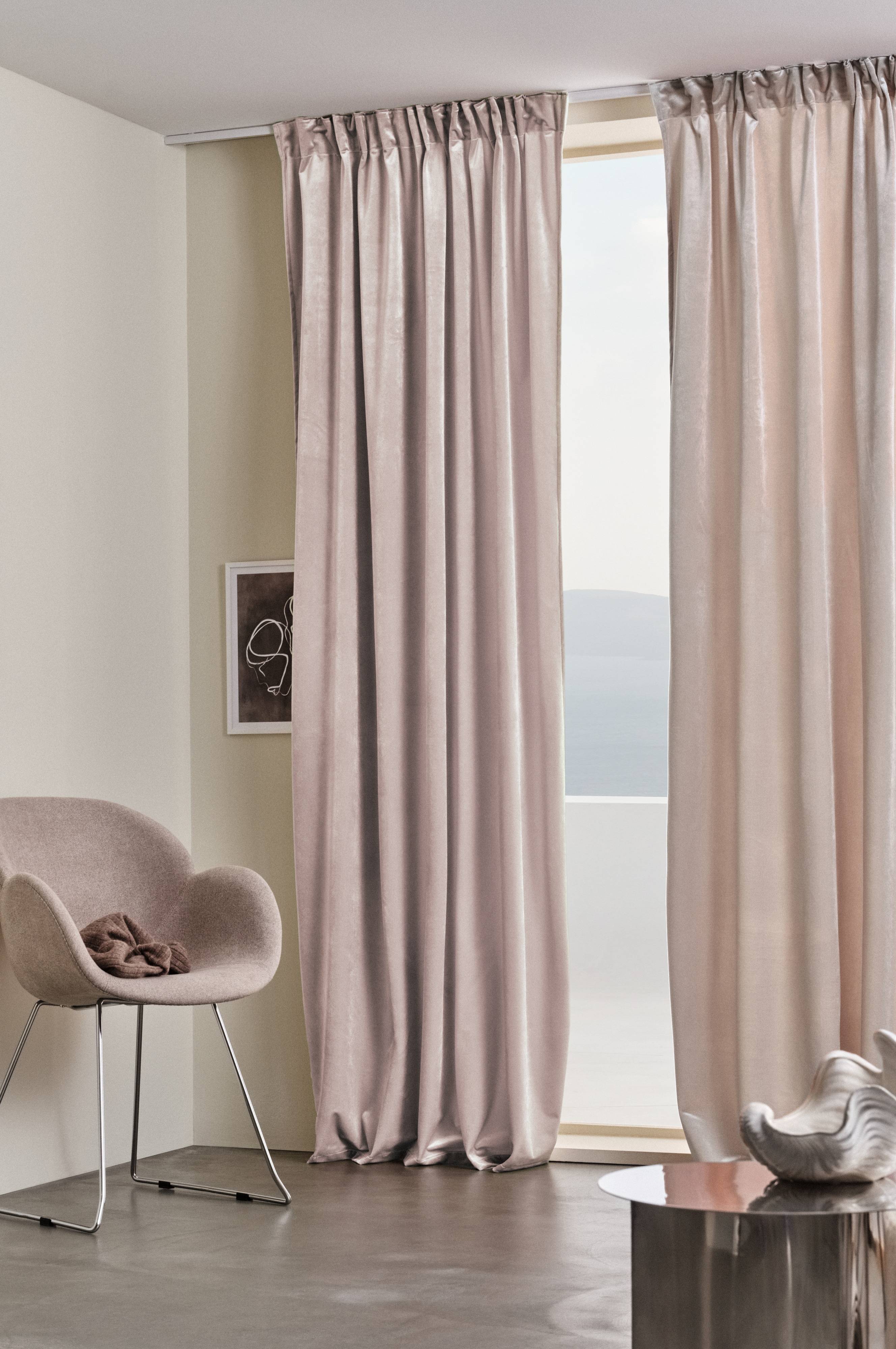 Två gardinlängder i elegant sammet av polyester. Sammetstyget skimrar vackert, färgnyansen upplevs olika beroende på hur ljuset faller. Längden har påsytt multifunktionsband. Gardinen kan hängas upp med fingerkrokar, kanal samt dold hälla.