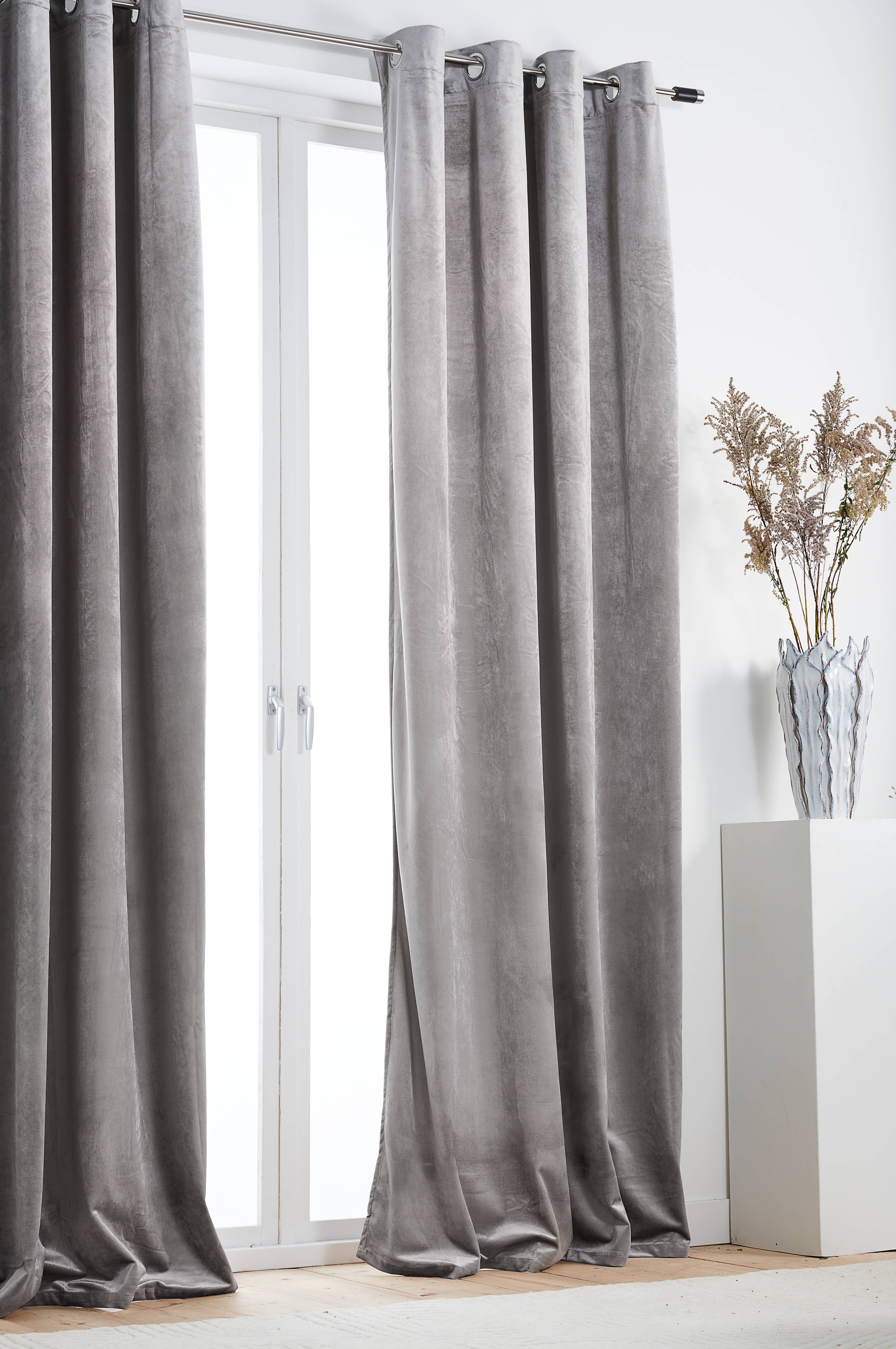 2-pack enfärgade öljettlängder i sammet. 8 st metallöljetter per längd. Lyxig gardin i tungt fallande sammet med en vacker lyster som ger rummet en mjuk känsla. En sammetsgardin med öljetter som ger ett böljande fall. Träs enkelt på en gardinstång.