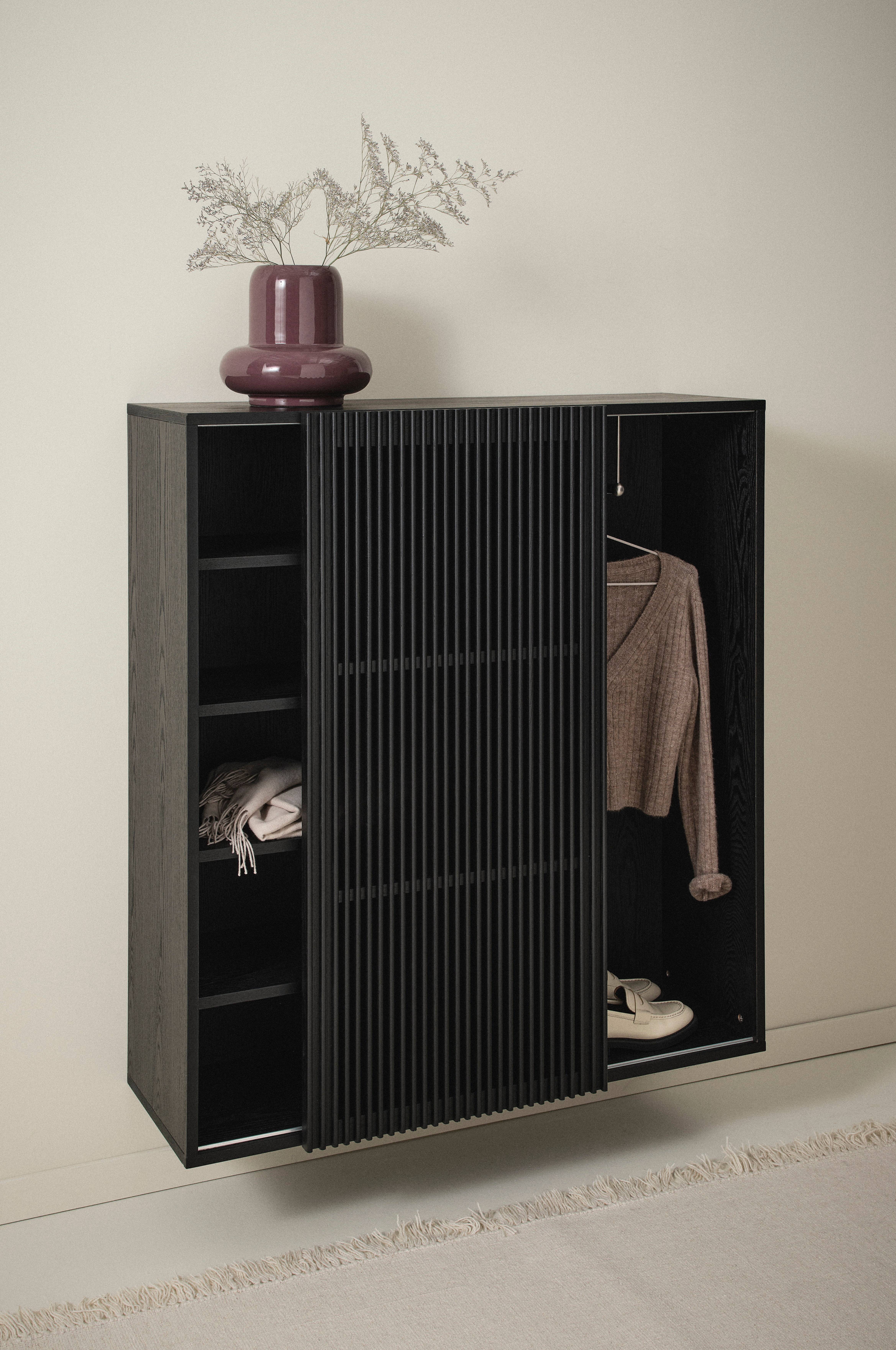Vägghängt skåp, perfekt hallförvaring med en skjutdörr av massiv ask, stomme av MDF med askfaner. Skåpet ger en naturlig känsla i sin skandinaviska stil med en touch av retro. Den stilrena dörren består av askribbor med rundad kant och lätt transparens uppstår i mellanrummen. Skjutdörren döljer halva skåpet där det finns hängare för kläder och resterande del blir öppna hyllor för till exempel skor, väskor, mössor och vantar. Skåpet har ett fyra hyllplan som kan justeras i höjd. Skruvar medföljer. Viss montering krävs. Monteringsanvisning medföljer.