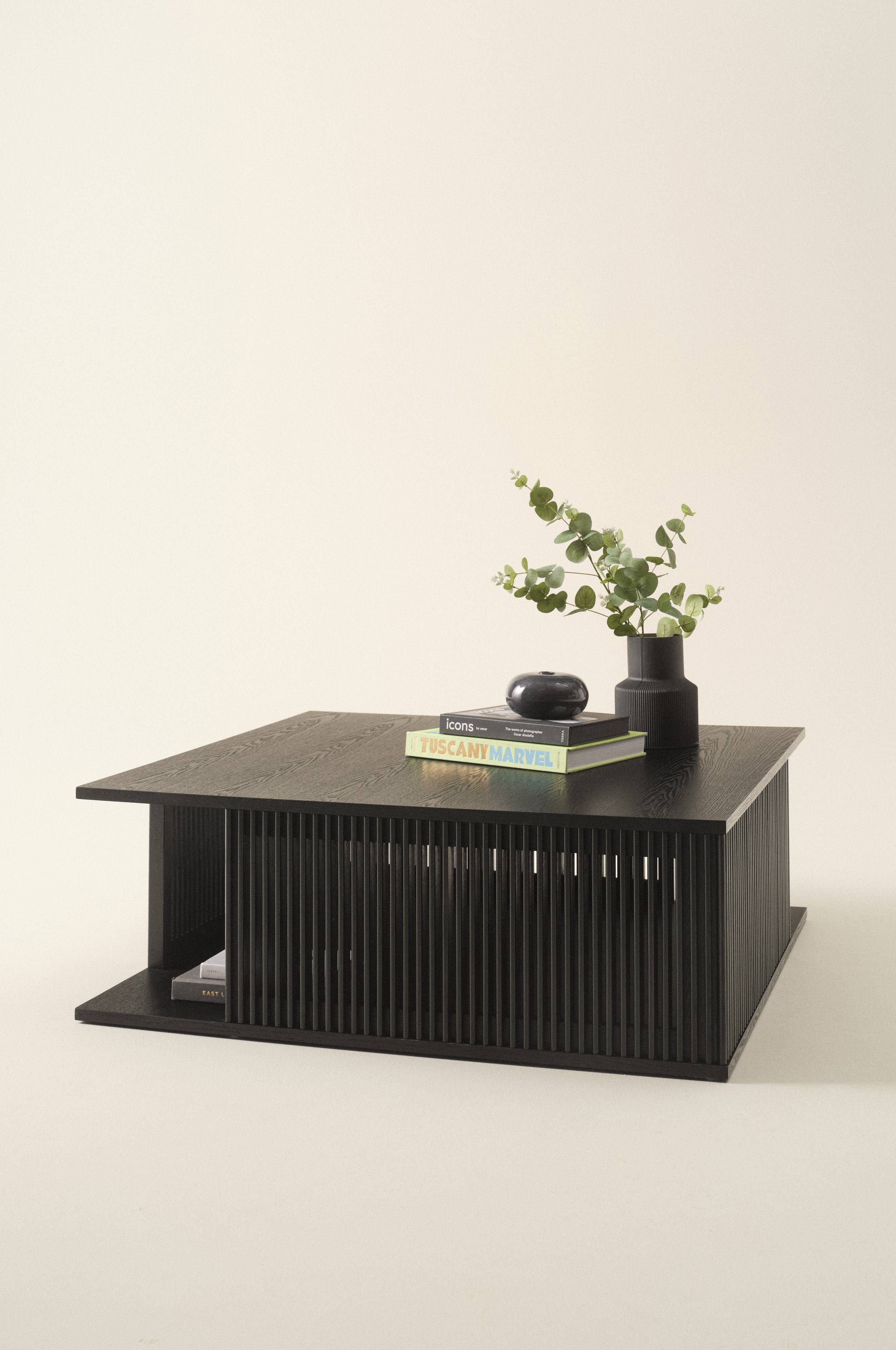 Kvadratiskt soffbord med vertikala ribbor runt om av massiv ask. Bordsskivan och stommen är tillverkade av MDF med askfaner. Bordet ger en naturlig känsla i sin skandinaviska stil med en touch av retro. De vackra askribborna har rundad kant och lätt transparens uppstår i mellanrummen. På varje sida om bordet finns en öppning så du kan utnyttja utrymmet under bordsskivan till förvaring.