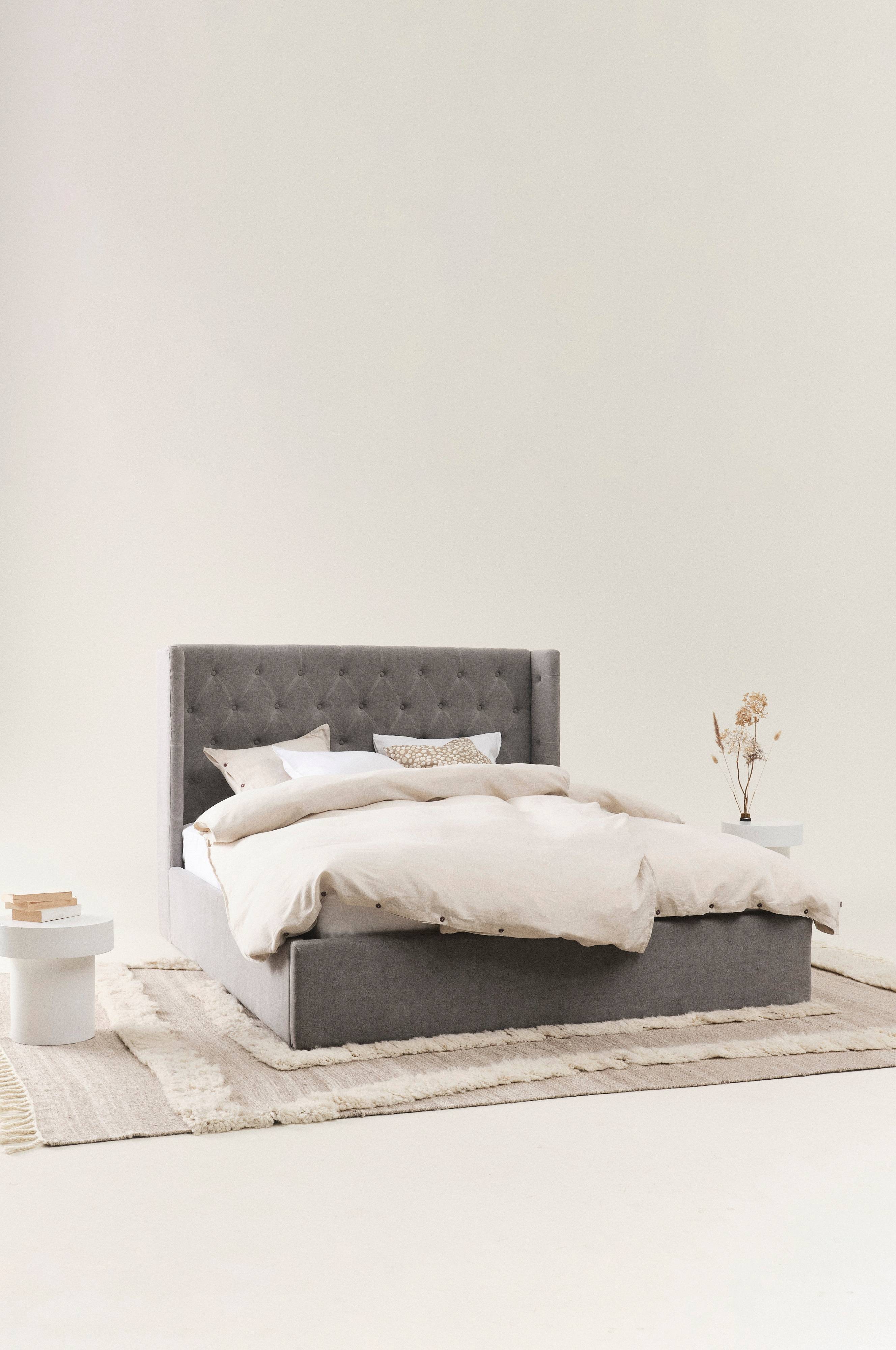 Sängram klädd i vackert linnetyg med mjuk vaddering. Huvudgaveln har dekorativa, djuphäftade, klädda knappar och en vinge på vardera sidan skapar mysig inramning. Sidorna och fotgaveln är stilrent släta och ramen runt sängen går nästan ända ned till golvet, bara en liten luftspalt lämnas som gör att luften kan cirkulera under sängen. Sängramen har ribbotten av furu och du kompletterar med madrasser eller resårmadrasser beroende på vilket du föredrar. Madrass/resårmadrass ingår ej.