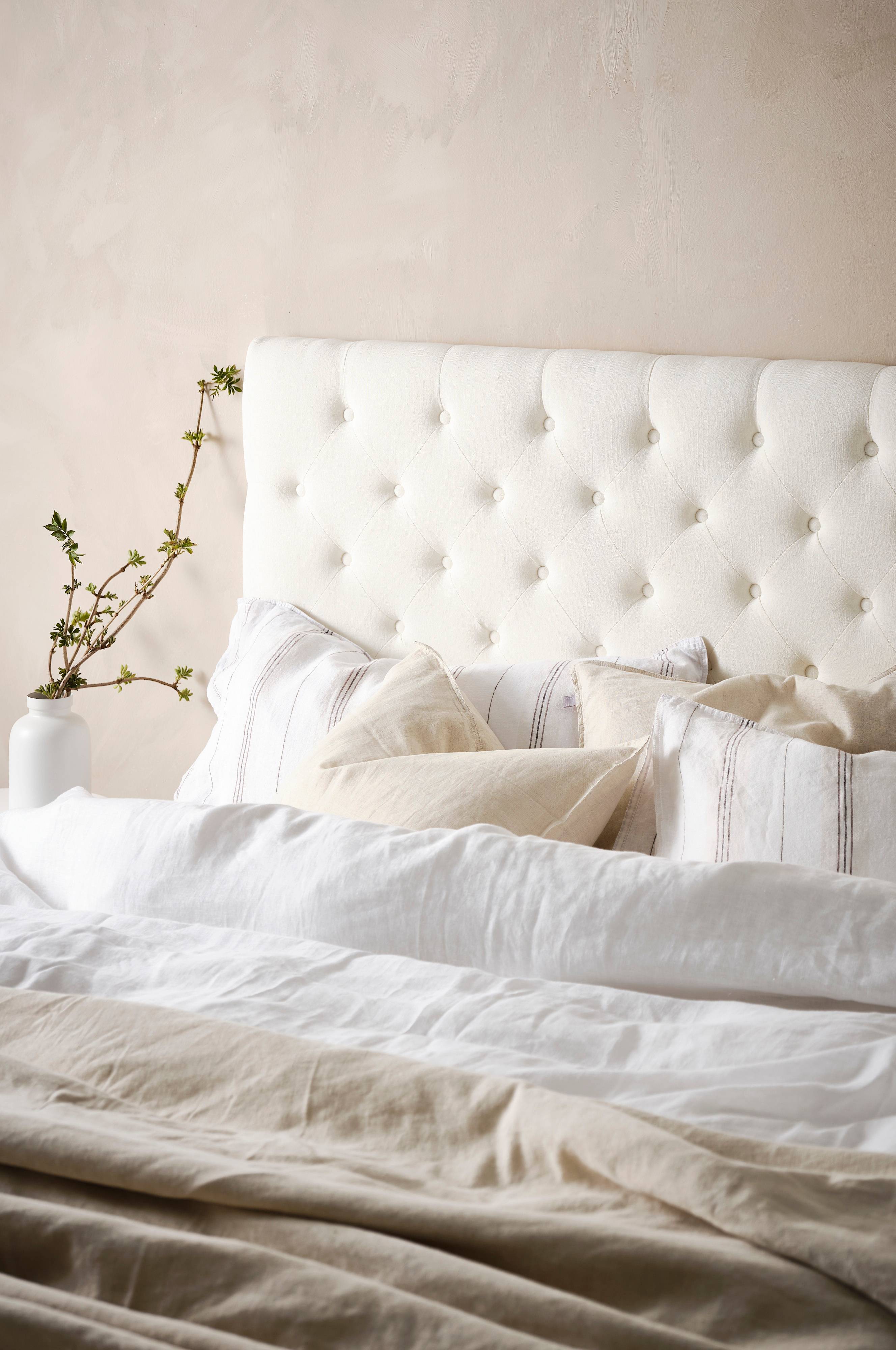 Fristående gavel klädd med linne och djuphäftade klädda knappar. Skapa hotellkänsla i sovrummet med en djuphäftad sänggavel i finaste linne. Väggfästen medföljer.