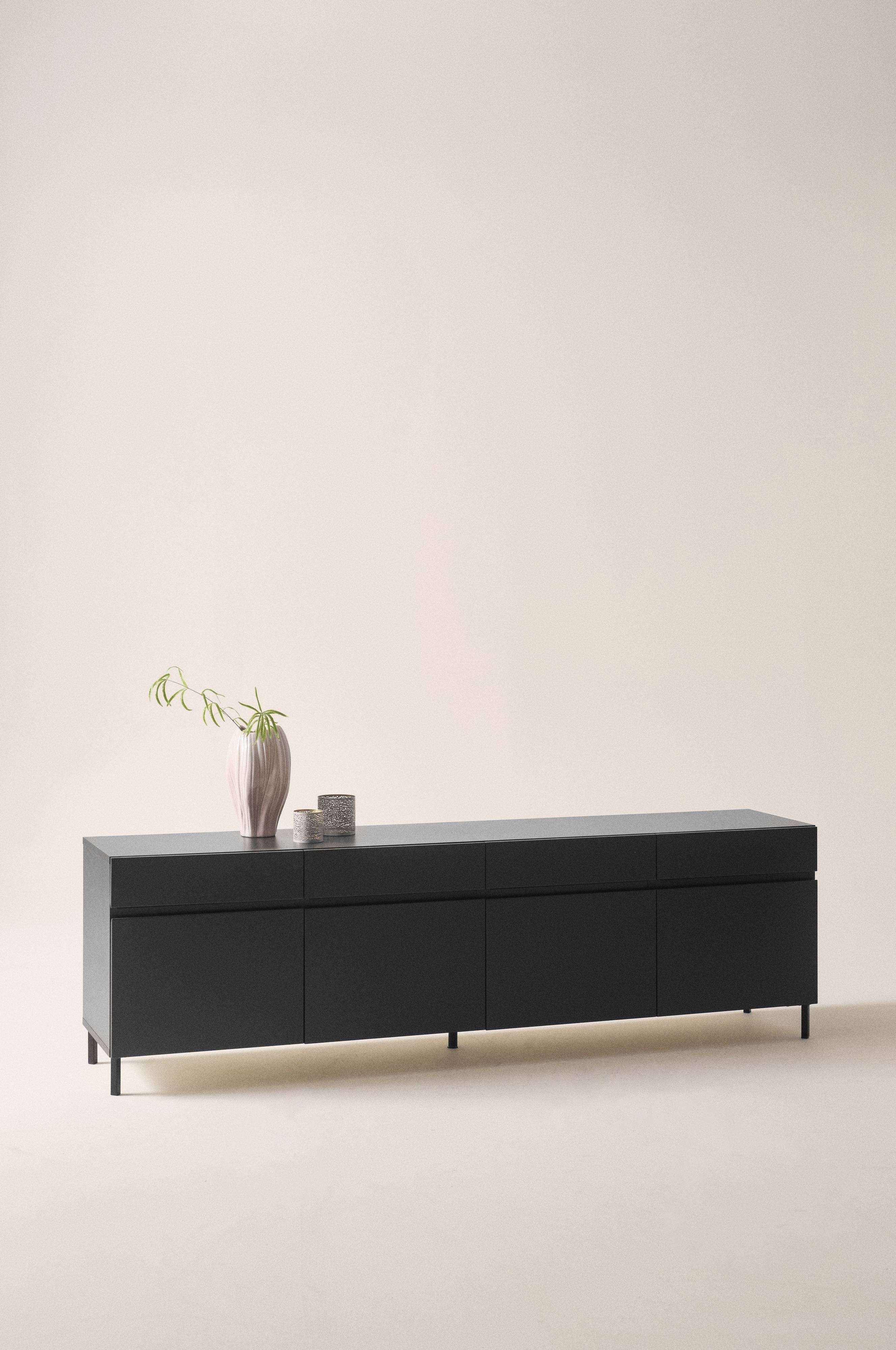 Svensktillverkat sideboard i MDF och spånskiva med mattlackad yta. SMÅLAND är ett stilrent och välarbetat hantverk med nordisk känsla. Skåpet har fyra lådor på rad upptill. Lådorna har snygg linnemönstrad sarg som effektfull dekor när lådan är öppen. Nedtill är det fyra skåpsluckor och till skåpen följer det med två hyllplan som du kan placera i de skåp du vill ha dem. Hyllorna kan placeras på valfri höjd i tre lägen. Både skåpsluckor och lådfronter har ett snyggt integrerat grepp längs kanten och de stängs mjukt med så kallad softclose-funktion. Luckorna har greppet i överkant och lådorna i underkant. De raka, svartlackerade benen är av stål. Viss montering krävs. .