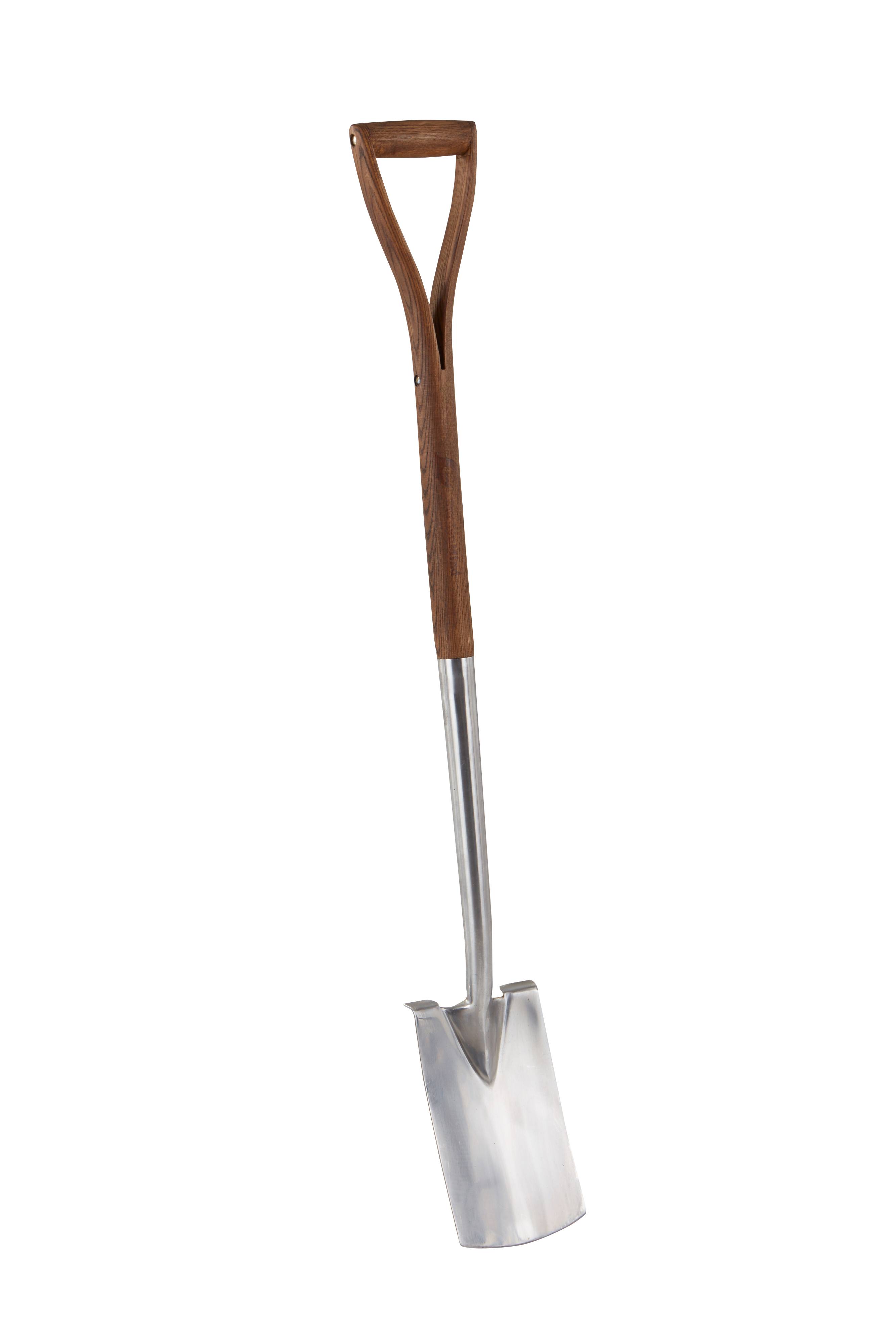 Rejäl spade i nättare modell av rostfritt stål. Handtag i mörkbetsat trä.
