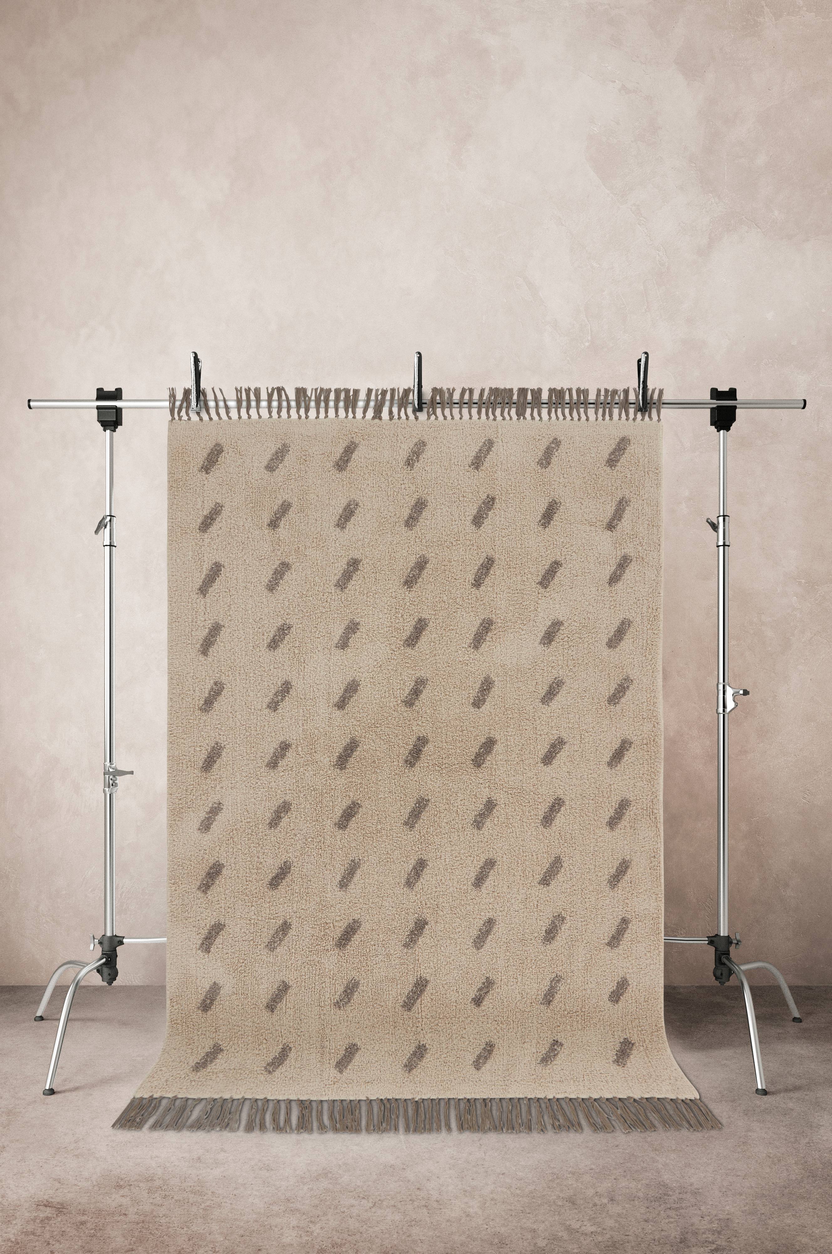 Tuftad matta av bomull med diagonala korta streck som skapar ett snyggt mönster. Mattan har en fin, knuten frans längs kortsidorna. Franslängd 8 cm. Lugghöjd 1 cm. Tjocklek 1,1 cm. 1500 g/m².