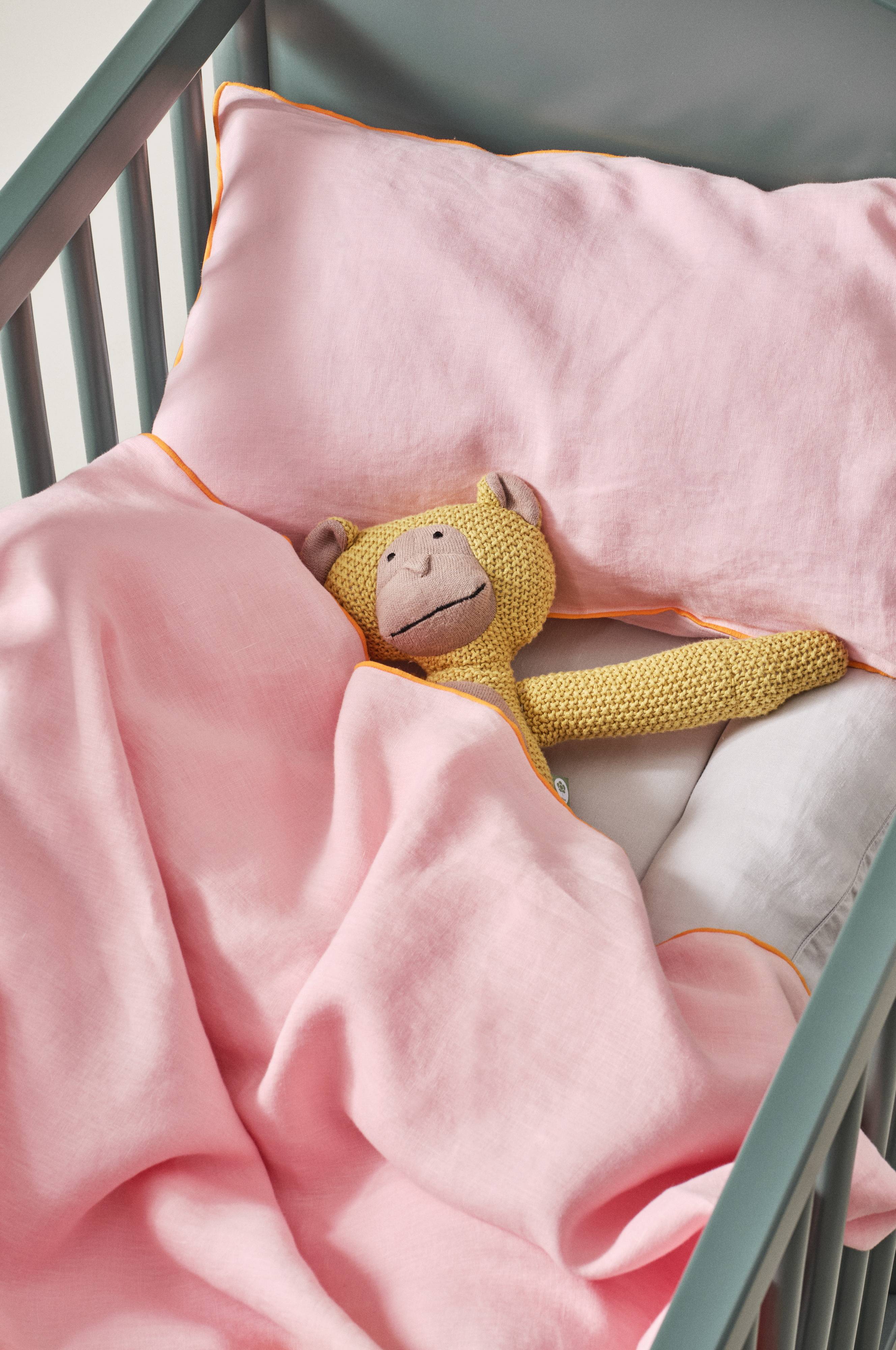 Påslakanset i två delar med ett påslakan och ett örngott av lin som tvättas för en extra mjuk känsla. Påslakansetet passar till spjälsäng. STICH står för schyssta sängkläder i ett tidlöst material. Linnetyget är enfärgat och den snygga overlocksömmen runt om är kontrastfärgad i en pigg färg. Lin är ett fint naturmaterial med speciella egenskaper och härlig känsla. Linne värmer när det är kallt och är svalt att sova i när det är varmt. När linet tvättas får det ännu mjukare struktur som är behaglig mot huden. Trådtäthet på 104 tc. (Trådtätheten talar om antalet trådar, thread counts, per kvadrattum i ett tyg. Ju högre trådtäthet desto högre kvalité. Med undantag för linne som ofta vävs glesare för att få den rätta känslan.)