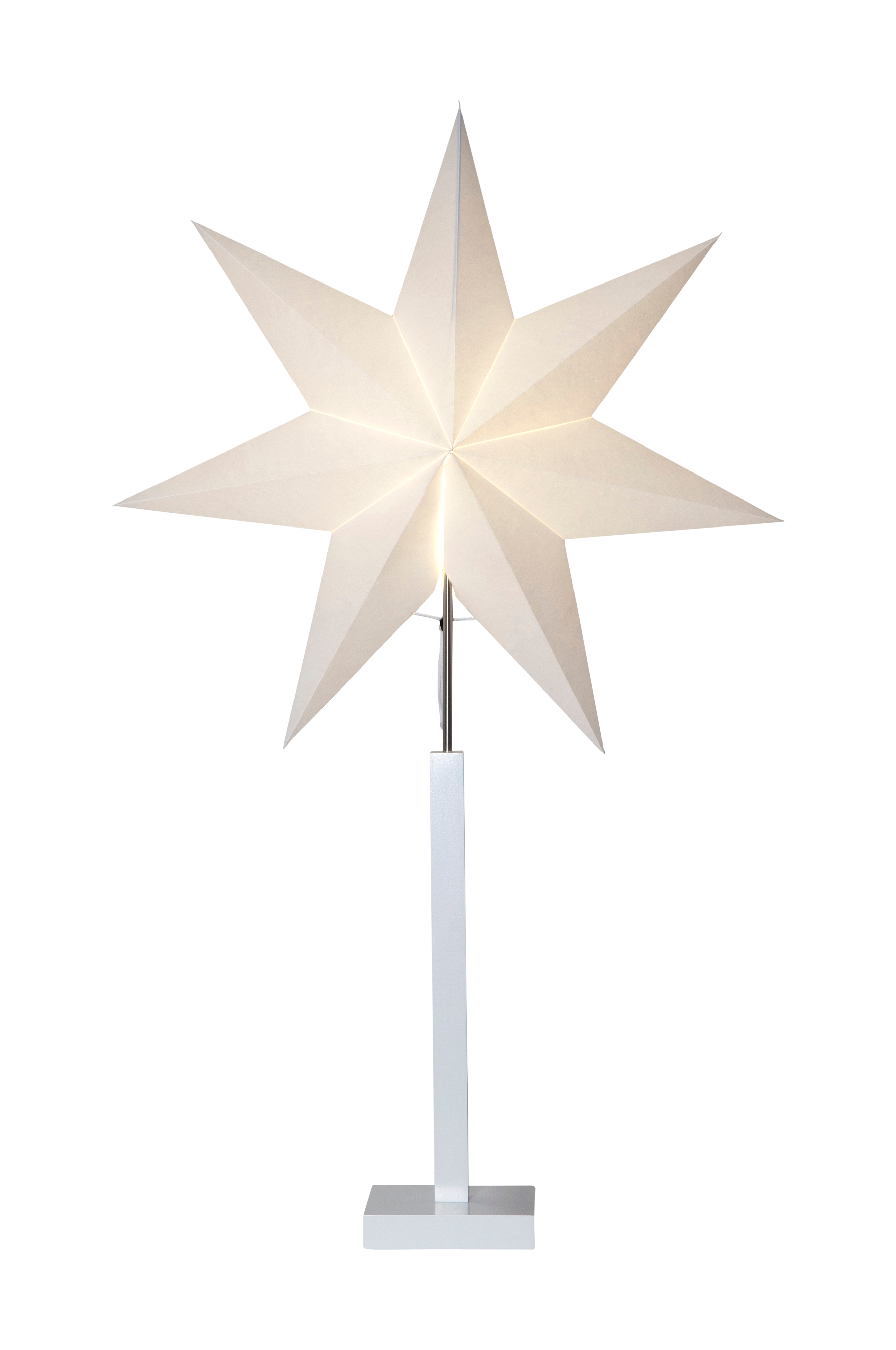 Stjärna på fot. Ger ett stilrent och modernt intryck, placera i fönstret för att skapa den perfekta stämningen. E14-sockel, ljuskälla ingår inte. Vit anslutningskabel, 180 cm. Höjd 100 cm, bredd/längd 60 cm och djup 22 cm. Max effekt 25W.