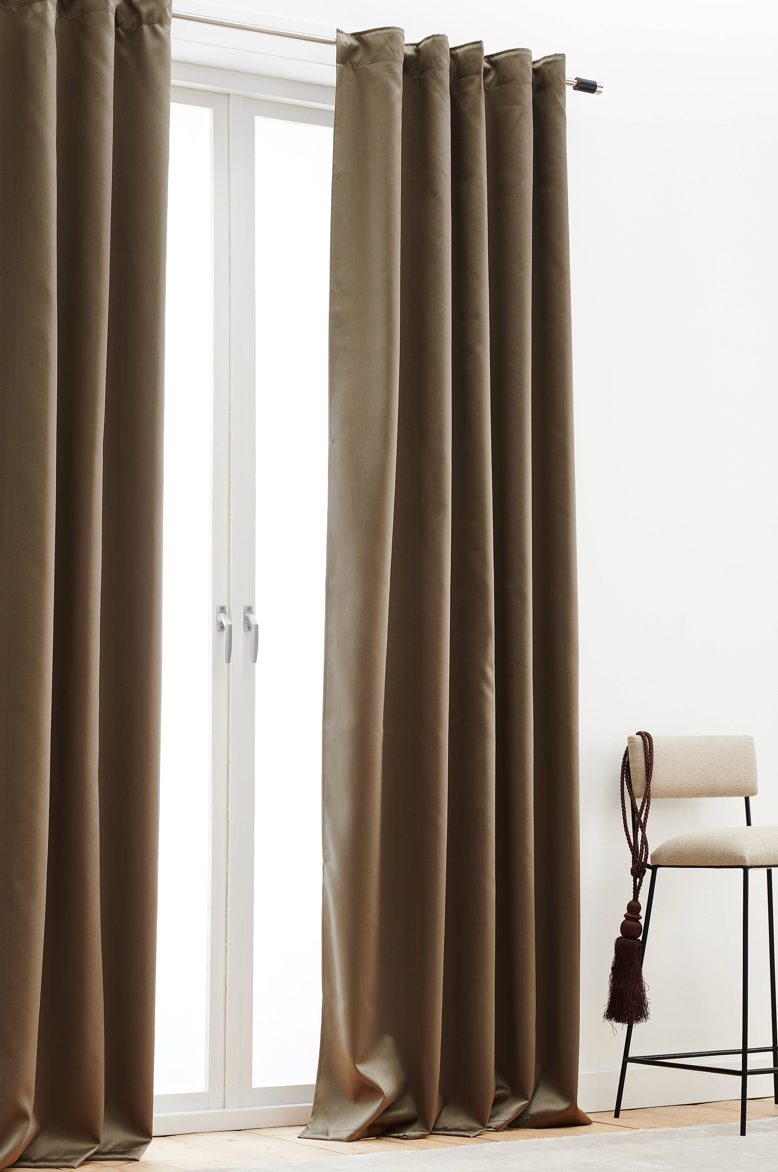 En gardinlängd i polyester med påsytt multifunktionsband och mörkläggande baksida. Gardinen kan hängas upp med fingerkrokar, kanal samt dold hälla.