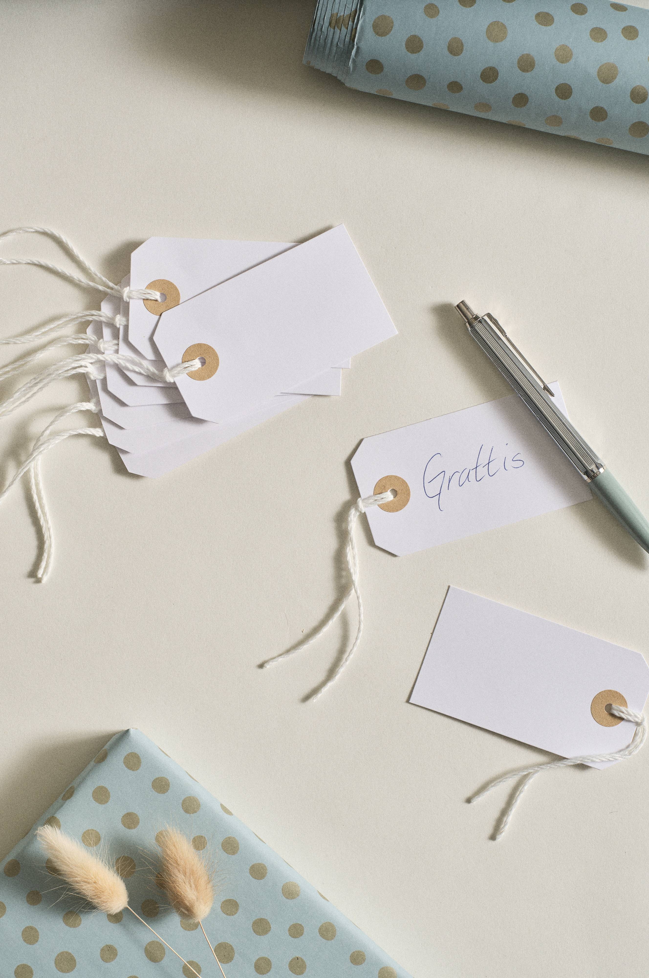 Fina present tags. Levereras med snören. Fina och praktiska