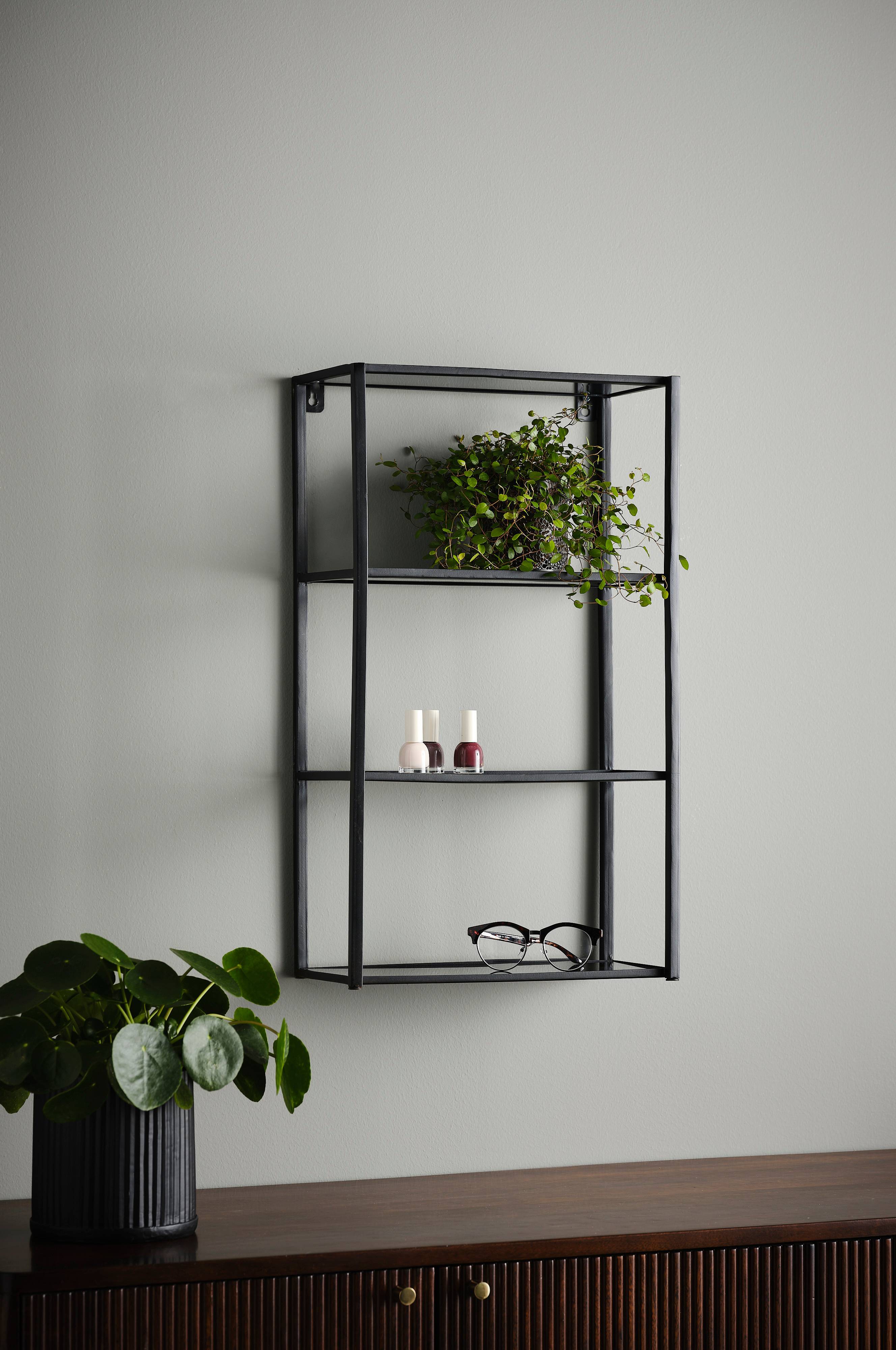 Vägghylla av pulverlackad metall med hyllor i rökfärgat glas. Nätt och smidig modell med hål för upphängning. Maxbelastning 15 kg.