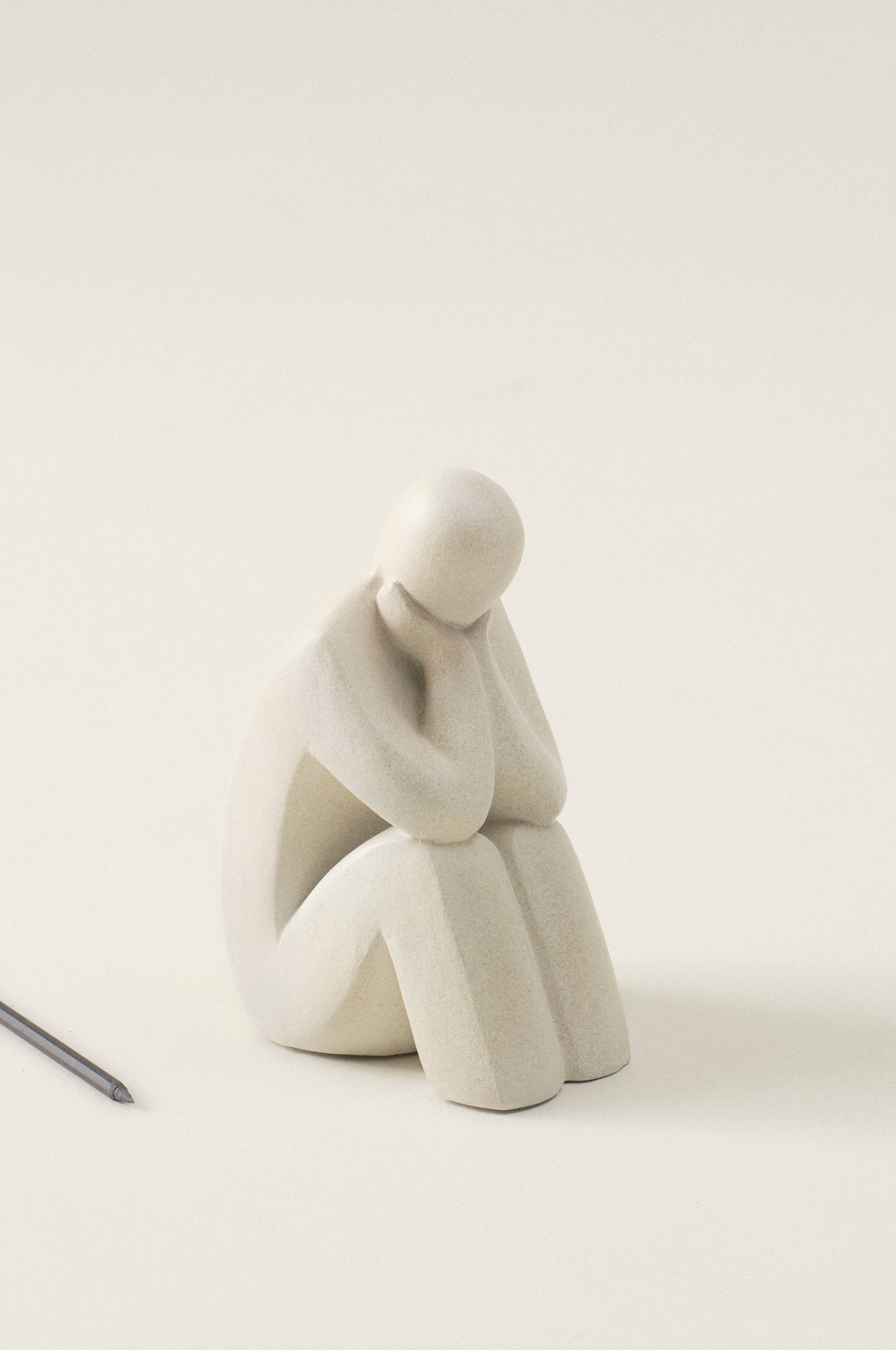 Handgjord skulptur av polyresin. Den funderande människan är stilrent skulpterad. Den beige färgen är lätt melerad och har matt yta som ger skultpuren ett harmoniskt och naturligt intryck. Det fina hantverket gör varje skulptur unik.