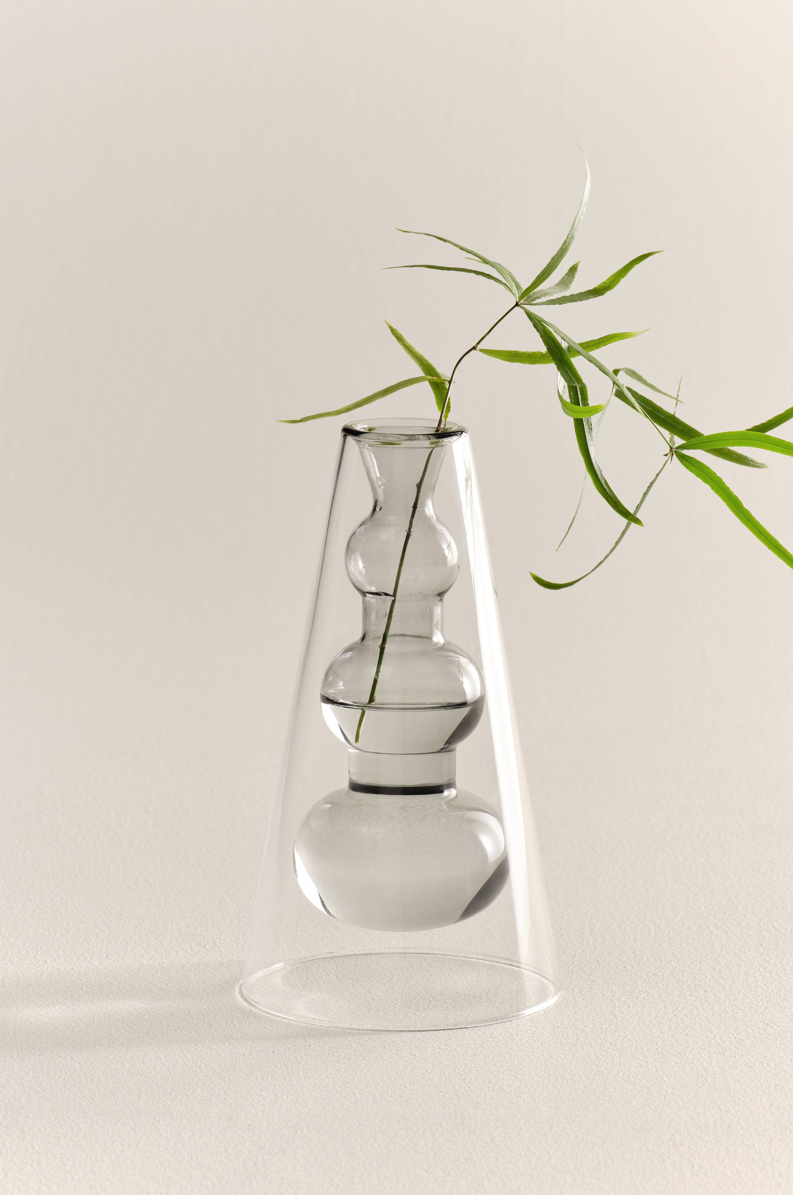 Den konformade vasen TILO GREY kombinerar klart glas och en dekorativ färgad innervas, vilket ger en unik design. Perfekt för att skapa ett konstnärligt uttryck i en modern inredning.