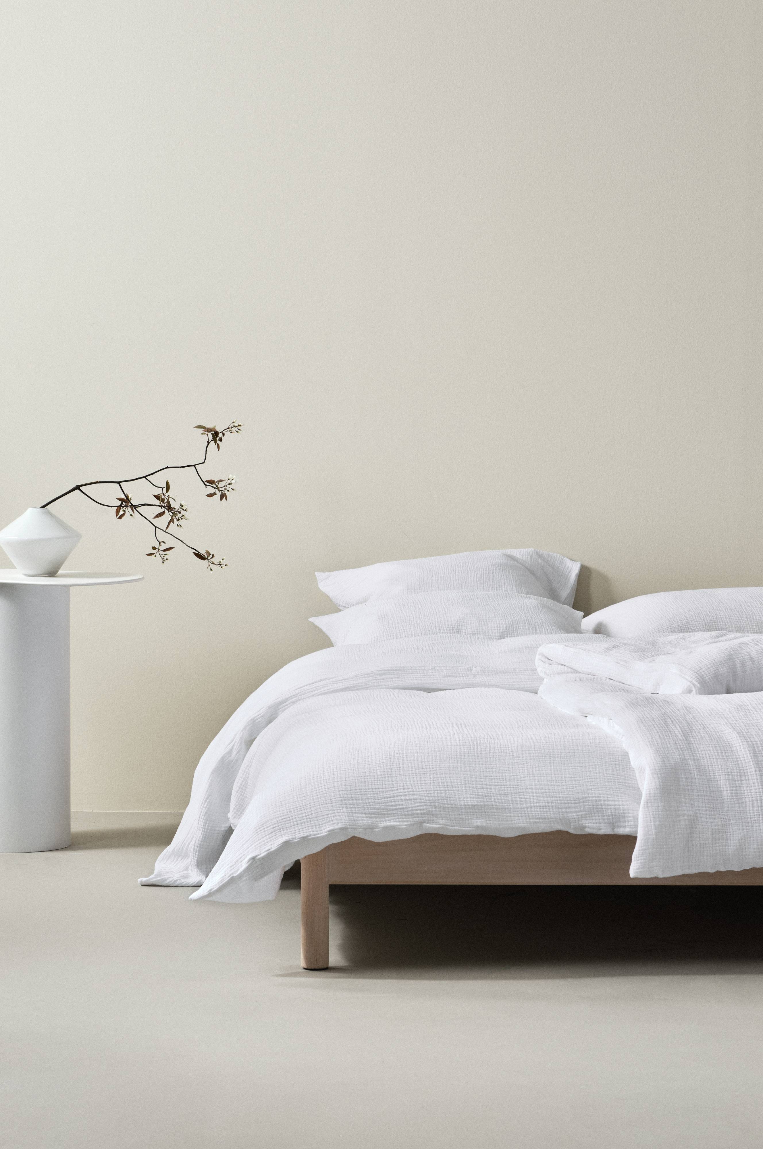 Enfärgat påslakanset med ett påslakan och ett örngott, i härlig, ekologisk bomullsmuslin. Muslin är ett mjukt, tunt tyg i två lager, vävt med lite bubblig effekt, vilket gör tyget mjukt och extra lättskött. Du behöver inte stryka eller mangla. Det är dessutom tvättat för en mjukare känsla och för att få fram den bubbliga strukturen, det behagliga muslintyget är skönt att sova i. Öppning i övre hörnen på påslakanet, som underlättar att trä påslakanet över täcket. Trådtäthet på 178 tc. (Trådtätheten talar om antalet trådar, thread counts, per kvadrattum i ett tyg. Ju högre trådtäthet desto högre kvalité.)