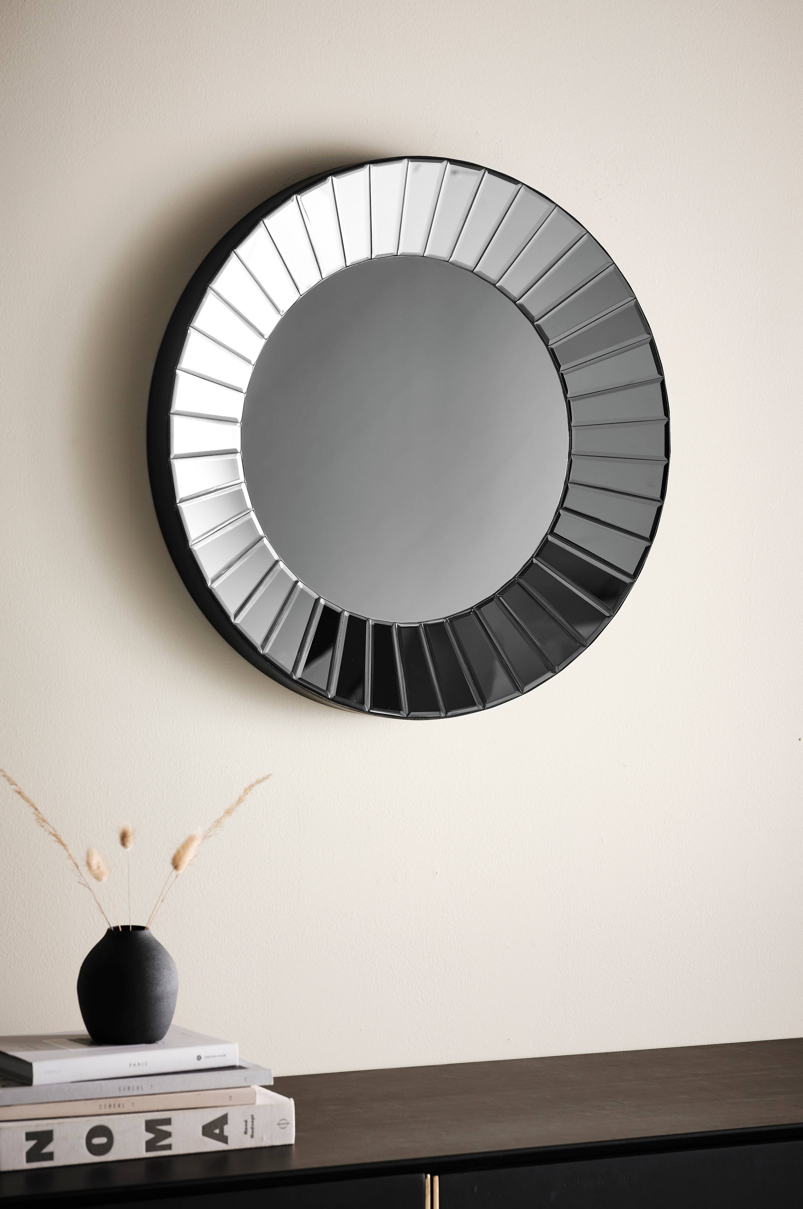 Rund spegel med baksida av MDF och en lätt utåtvinklad, dekorativ ram av spegelglas runtom.