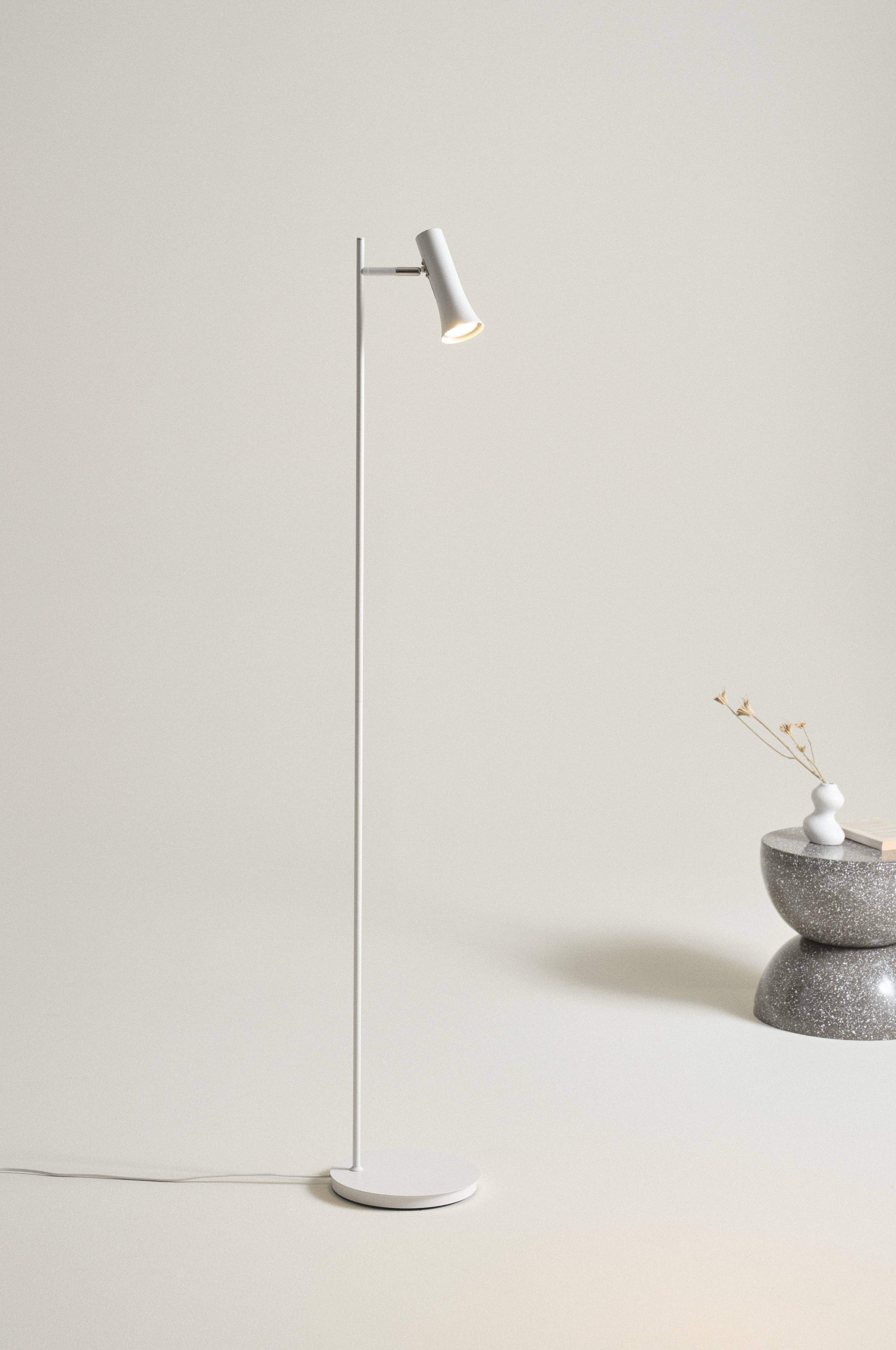 Golvlampa av metall med liten och smidig lampskärm som ger bra läsljus. Lampan är stilren och lättplacerad, perfekt vid läsfåtöljen. Transparent sladd.
