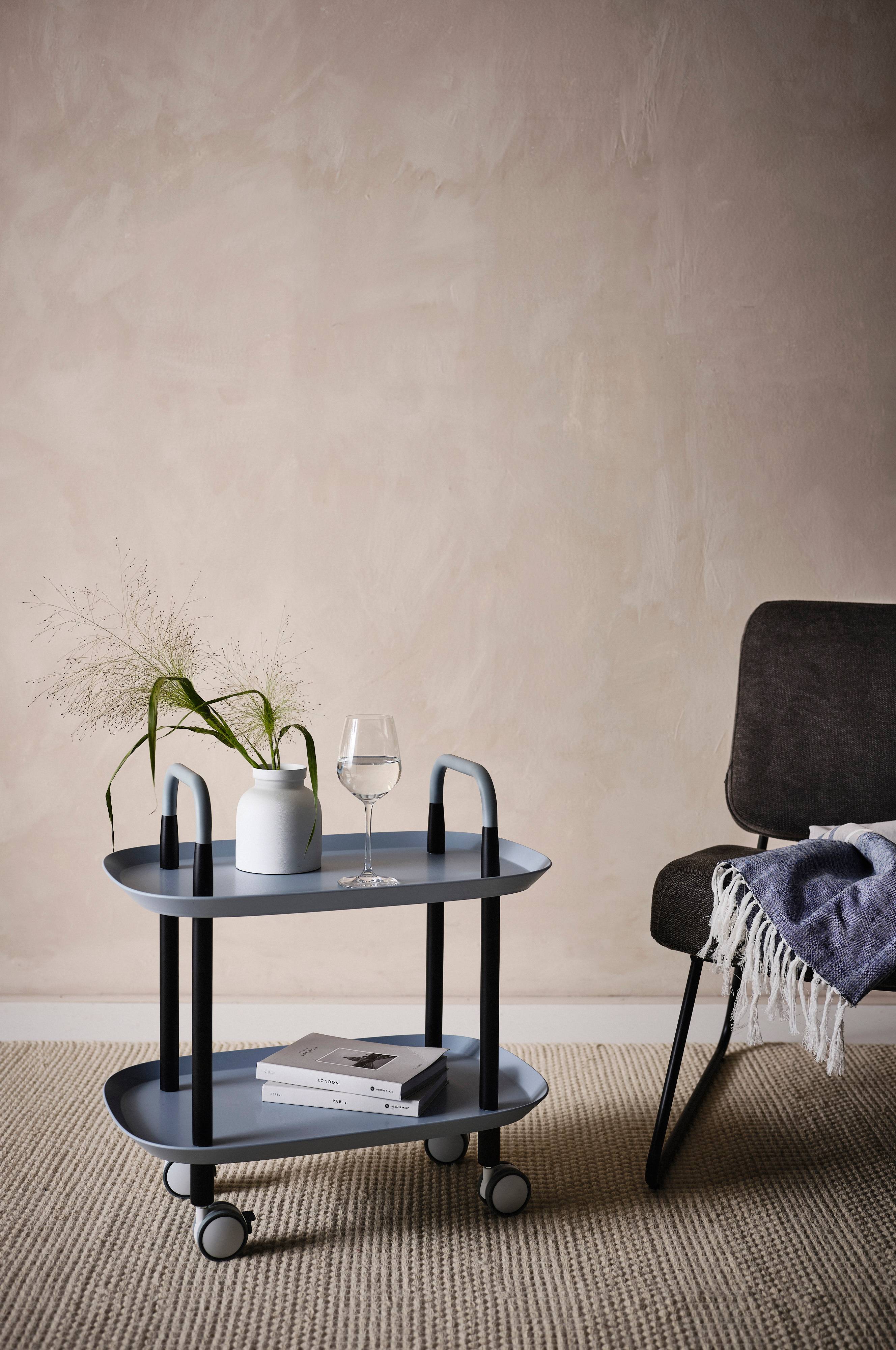 Serveringsvagn med två hyllplan av formgjuten ABS-plast, träben av bok och handtag av lackerad metall. En mycket användbar och praktisk serveringsvagn som förenar funktion och design. Vagnen har fyra hjul och handtag som dessutom gör den enkel att lyfta över tröskeln. Viss montering krävs. Monteringsanvisning medföljer.